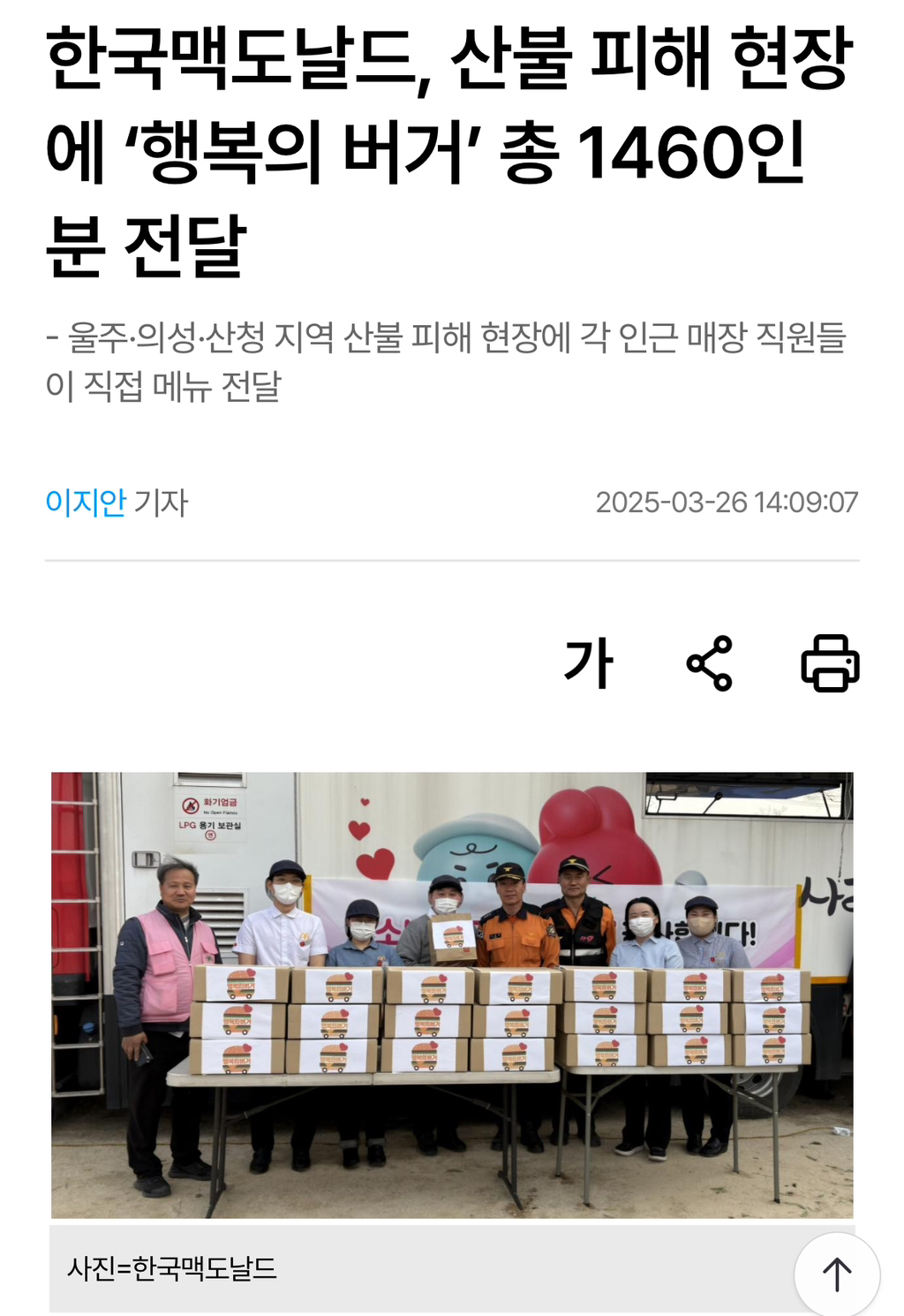 [여시뉴스데스크]한국맥도날드, 산불 피해 현장에 ‘행복의 버거’ 총 1460인분 전달