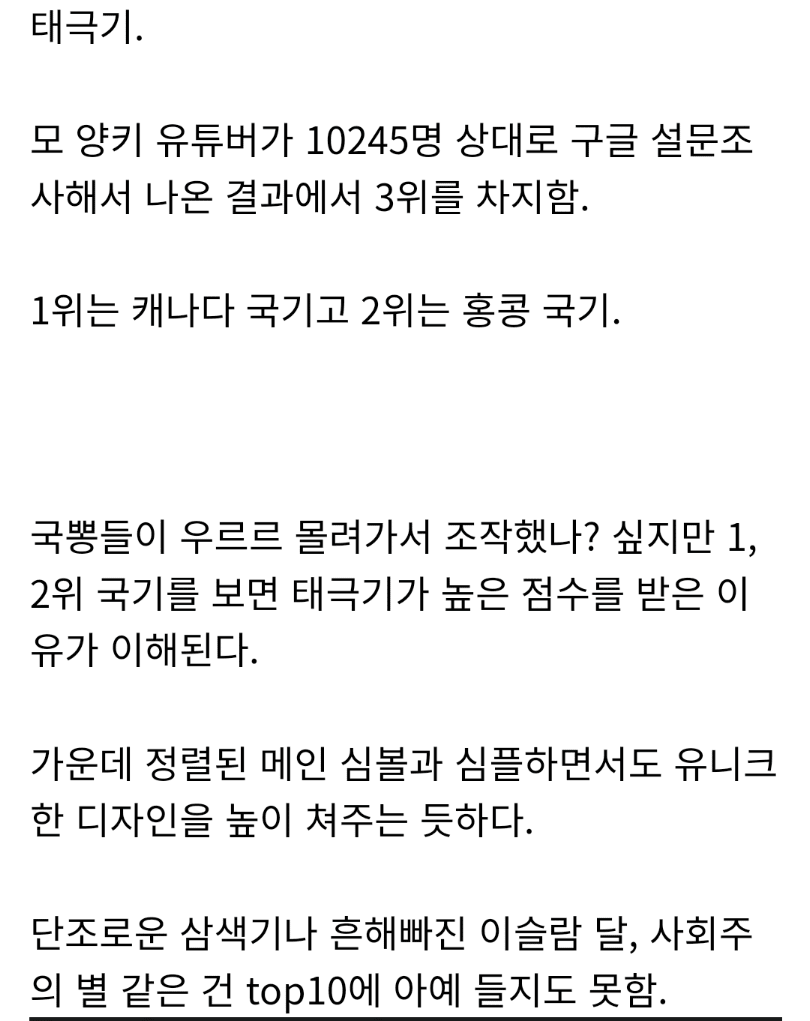 [흥미돋]외국인들에게 인기 많다는 태극기 디자인 작성자귤토끼이|작성시간25.03.28|조회수34,897 목록 댓글 47 글자크기 작게가 글자크기 크게가 출처: https://theqoo.net/square/3669211417 다음검색 현재 게시글 추가 기능 열기 북마크 공유하기 신고 센터로 신고 댓글 댓글 47 댓글쓰기 답글쓰기 댓글 리스트 작성자곽복덕 | 작성시간 25.03.28 음양과 건곤감리.. 의미도 존나 킹갓제너럴 어쩌구임 작성자말 차 | 작성시간 25.03.28 존나 본새잖음 국기 ㅈㄴ 한국다움 작성자꾸운옥수수 | 작성시간 25.03.28 개예쁨 태극기 작성자Hyper Knife | 작성시간 25.03.28 태극기 1위. 국뽕 빼고는 갠적으로 미국 국기 예쁨 작성자피노누아 | 작성시간 25.03.29 원앤온리긴해 다른데는 지들끼리 랜덤돌린것처럼 비슷한데 댓글 전체보기