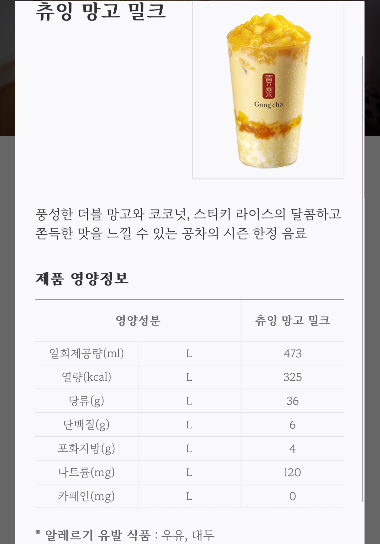 *여성시대* 차분한 20대들의 알흠다운 공간 [흥미돋]공차 시즌 메뉴 츄잉 망고 밀크 출시 작성시간25.03.28|조회수20,875 목록 댓글 28 글자크기 작게가 글자크기 크게가 출처: 여성시대 바나나스플릿구슬 다음검색 현재 게시글 추가 기능 열기 북마크 공유하기 신고 센터로 신고 댓글 28 댓글 리스트 작성시간 25.03.28 헐 궁금해애앵 낼 먹어야지 작성시간 25.03.28 이 글 보자마자 사먹었는데나는 달고 차가운 물에 담긴 쌀알이 어색하게 느껴진다 ㅜ 작성시간 25.03.28 스티키라이스 우왕 작성시간 25.03.28 당류 36이면 액상과당치고 선방이다 작성시간 25.03.29 디졋다 미친 카페 방문해 더 많은 댓글 만나기!