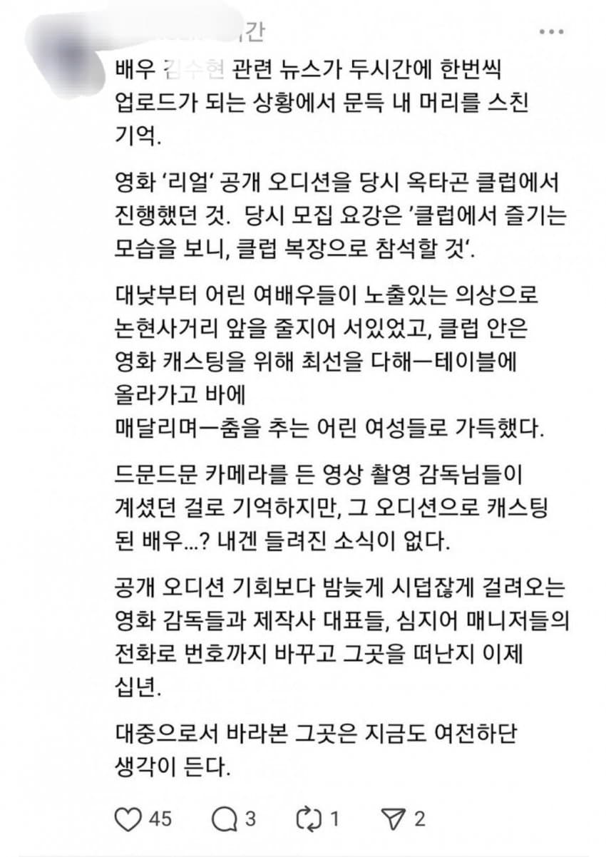 [기타]김수현 영화 '리얼' 오디션 후기 작성자떡볶이보유국가|작성시간25.03.28|조회수67,547 목록 댓글 57 글자크기 작게가 글자크기 크게가 출처: 여성시대 떡볶이보유국가 다음검색 현재 게시글 추가 기능 열기 북마크 공유하기 신고 센터로 신고 댓글 댓글 57 댓글쓰기 답글쓰기 댓글 리스트 작성자조이가joy | 작성시간 25.03.29 웩 작성자피노누아 | 작성시간 25.03.29 씨발새끼 작성자전 도연 | 작성시간 25.03.29 저급해 작성자돈컬 | 작성시간 25.03.30 기괴하다 작성자노으을 | 작성시간 25.04.03 미친 댓글 전체보기