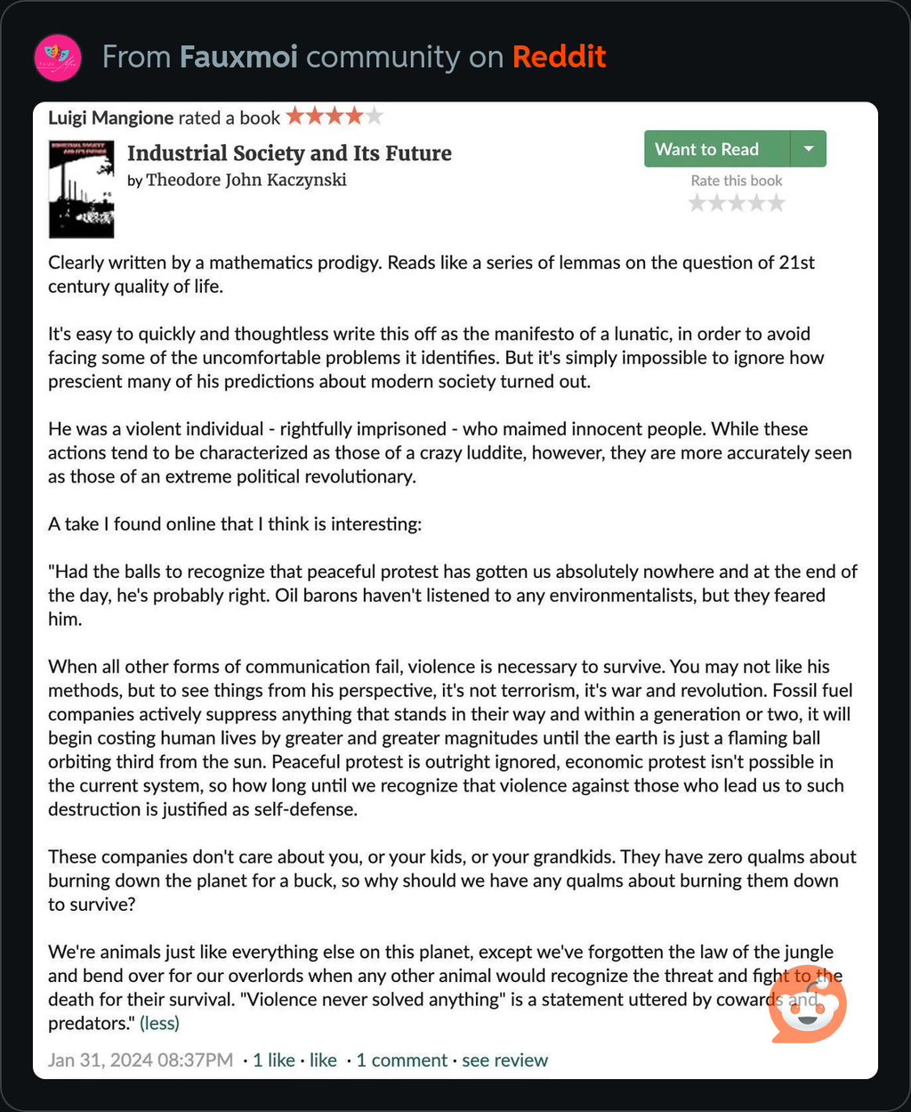 모든 형태의 의사소통이 실패했을 때, 생존을 위해 폭력이 필요하다. 그의 방법을 좋아하지 않을 수도 있지만, 그의 관점에서 보면 이는 테러가 아니라 전쟁이자 혁명이다. 화석연료 회사들은 자신들의 길을 방해하는 모든 것을 적극적으로 억압하며, 한두 세대 안에 점점 더 많은 인간의 생명을 앗아가기 시작할 것이다. 결국 지구는 태양을 도는 세 번째 타오르는 불덩이가 될 것이다. 평화적 시위는 철저히 무시되고, 현재의 시스템에서는 경제적 저항도 불가능하다. 그렇다면 우리를 이러한 파괴로 이끄는 자들에 대한 폭력이 자기방어로 정당화된다는 사실을 언제쯤 인정하게 될까?