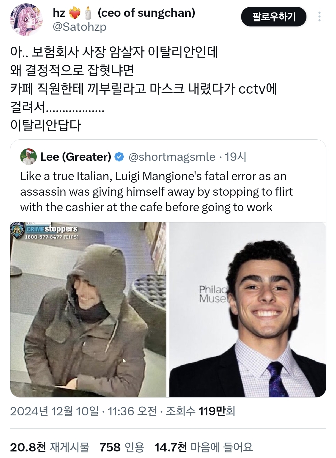 26세 이탈리아계 미국인 루이지 맨지오니(Luigi Mangione)