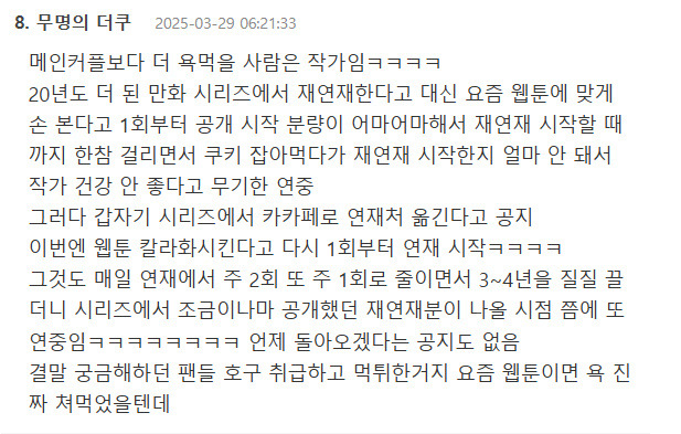 독자들 돈 쓰게 하고 기약 없는 연중엔딩이라 사실상 그 동정표도 다 사라짐