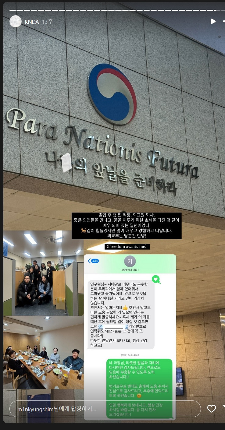 석사 과정 때 서울대 국제대학원 연구보조원, 유엔 산하기구 인턴 해서