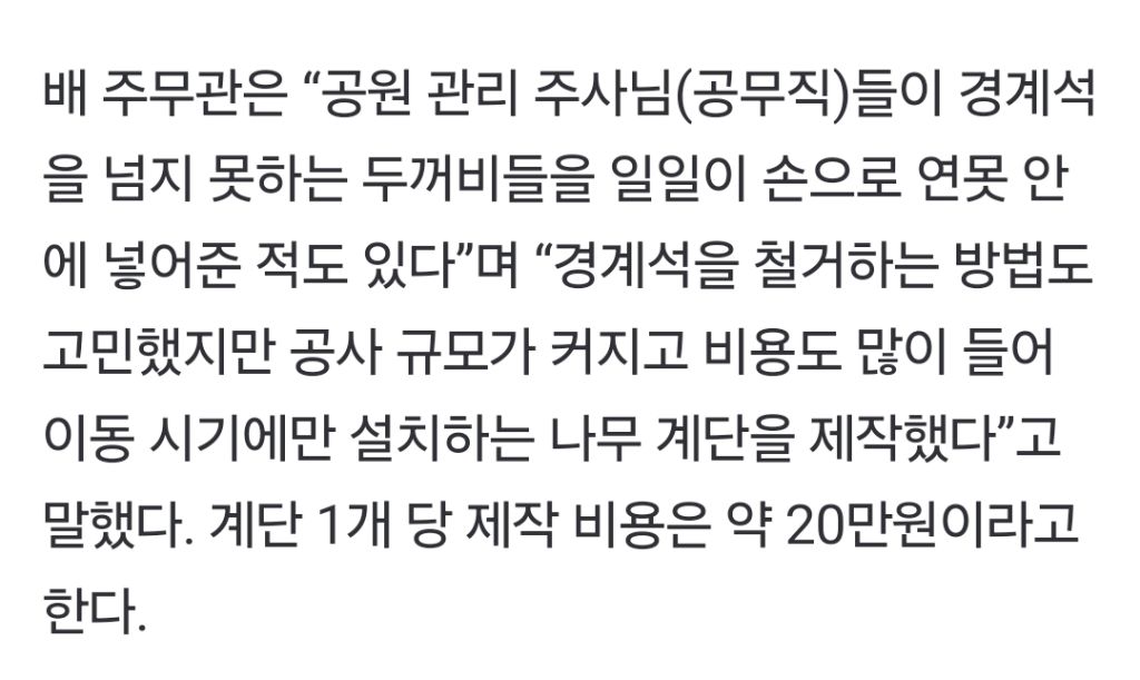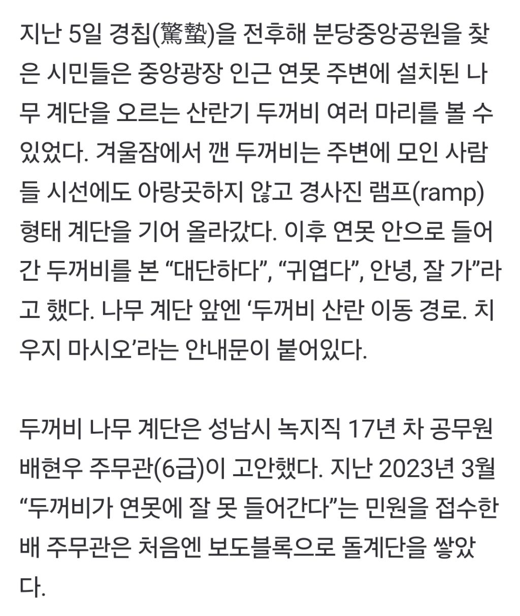 *여성시대* 차분한 20대들의 알흠다운 공간 [여시뉴스데스크]국립생태원도 칭찬한 '두꺼비 계단'…17년차 공무원 아이디어 작성시간25.04.01|조회수34,362 목록 댓글 41 글자크기 작게가 글자크기 크게가 출처: https://naver.me/GV2fN135국립생태원도 칭찬한 '두꺼비 계단'…17년차 공무원 아이디어 | 중앙일보경기 분당중앙공원 두꺼비들에게 새로운 길이 열렸다.www.joongang.co.kr이하 생략 전문 원본 기사로 봐주세요! 다음검색 현재 게시글 추가 기능 열기 북마크 공유하기 신고 센터로 신고 댓글 41 댓글 리스트 작성시간 25.04.01 너무 좋다 ㅠㅠ 같이 살자 같이 작성시간 25.04.01 ㅜㅜㅜㅜㅜ아너무귀여워 작성시간 25.04.01 하여간 눈먼돈들은 잘도 찾는다 나쁜놈들 작성시간 25.04.01 아 두꺼비 너무 귀엽다 ㅜㅜㅜㅜㅜ 작성시간 25.04.01 하 너무 귀엽고 인류애(?) 넘치는... 카페 방문해 더 많은 댓글 만나기!