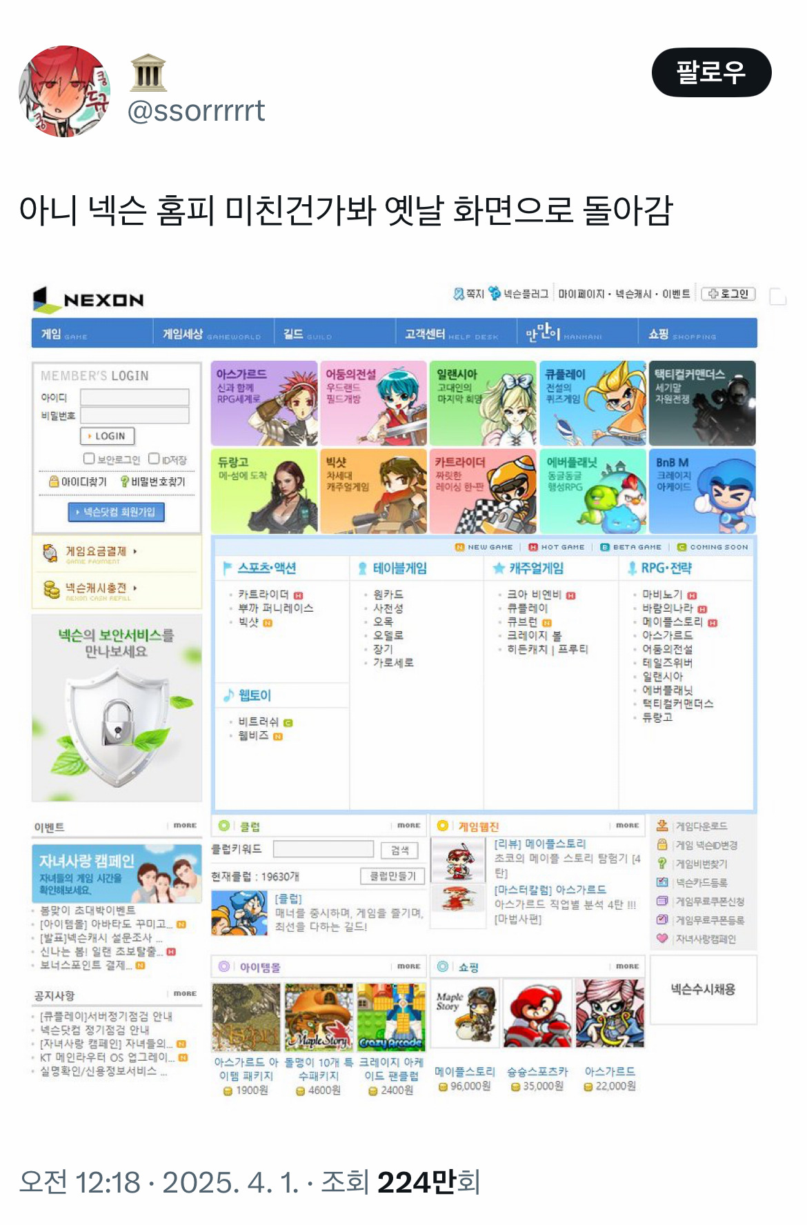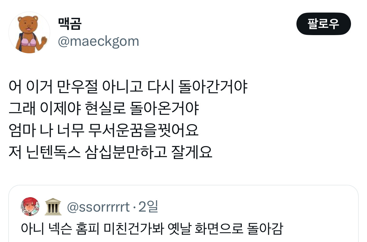 *여성시대* 차분한 20대들의 알흠다운 공간 [흥미돋]그래 이제야 현실로 돌아온거야 엄마 나 너무 무서운꿈을꿧어요.twt 작성시간25.04.03|조회수30,533 목록 댓글 9 글자크기 작게가 글자크기 크게가 출처: https://twitter.com/search?q=https://twitter.com/maeckgom/status/1906936062854955250 만우절 당일 다음검색 현재 게시글 추가 기능 열기 북마크 공유하기 신고 센터로 신고 댓글 9 댓글 리스트 답댓글 작성시간 25.04.03 ㅋㅋㅋㅋㅋㅋ앜ㅋㅋㅋ진짴ㅋㅋㅋㅋㅋ방해안받고 시원하게자는사람 ㅠ 작성시간 25.04.03 와 ㅈㄴ추억... 작성시간 25.04.03 큐플레이 ㅠ 작성시간 25.04.03 ㅠㅠㅠ시발 ㅠㅠ 작성시간 25.04.03 뿌까 퍼니레이스ㅜ 카페 방문해 더 많은 댓글 만나기!