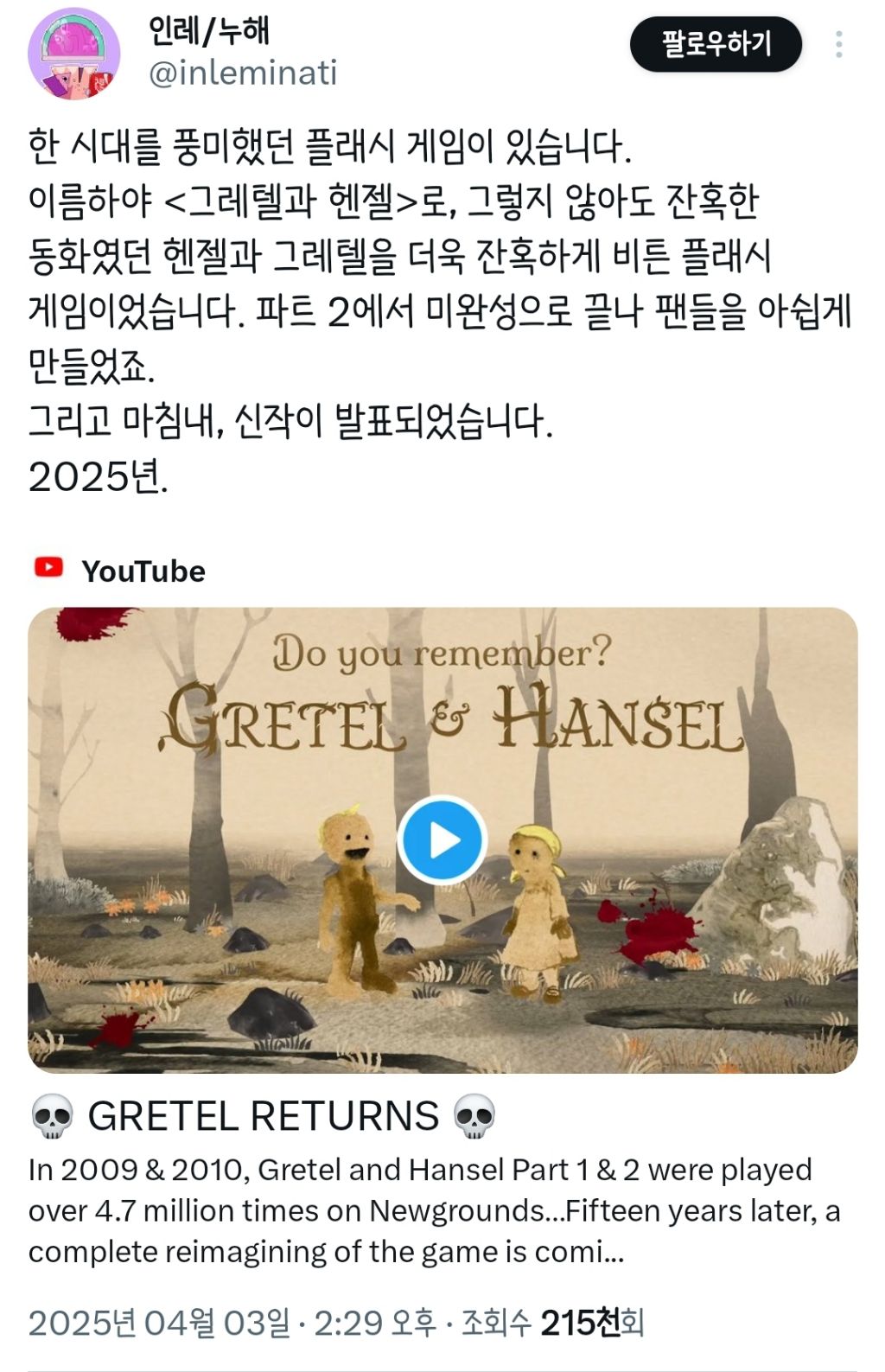 [흥미돋]게임 <그레텔과 헨젤> 신작 출시 작성자루기헴|작성시간25.04.03|조회수12,662 목록 댓글 26 글자크기 작게가 글자크기 크게가 출처: https://x.com/inleminati/status/1907666695197700320?t=rTArgU6XPfV8obGmDqhCPw&s=19X의 인레/누해님(@inleminati)한 시대를 풍미했던 플래시 게임이 있습니다. 이름하야 <그레텔과 헨젤>로, 그렇지 않아도 잔혹한 동화였던 헨젤과 그레텔을 더욱 잔혹하게 비튼 플래시 게임이었습니다. 파트 2에서 미완성으로x.com올해 4분기 스팀으로 출시 다음검색 현재 게시글 추가 기능 열기 북마크 공유하기 신고 센터로 신고 댓글 댓글 26 댓글쓰기 답글쓰기 댓글 리스트 작성자나무너무나무 | 작성시간 25.04.03 어 귀엽다 작성자발꼬락치즈냄새 | 작성시간 25.04.03 와 이게 나오네 작성자aeeshlsbk | 작성시간 25.04.03 ㅁㅊ 드디어 작성자미세먼지 스타삣 | 작성시간 25.04.03 주여ㅠㅠ 작성자three days and a life | 작성시간 25.04.03 와 이게나오네 진짜 후속작궁금했는데.... 댓글 전체보기