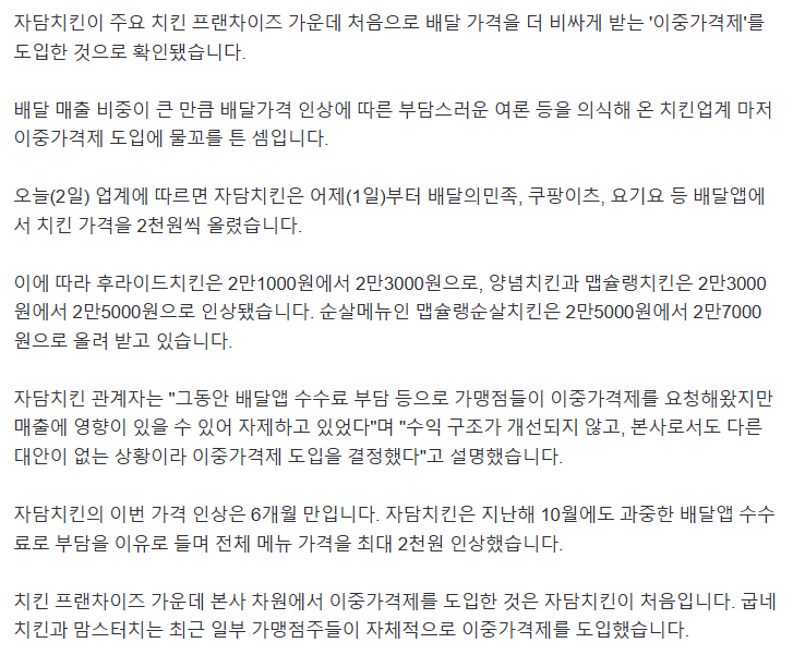 작성자집에보내주시면안될까요? 작성시간 25.04.06 ㅇㅈ 나는 배달 불가 지역에서 살고 자담치킨 자주 포장해서 먹었는데 좋았음ㅎㅎ 그리고 젤 중요한거는 이중 가격제 안하는거 같아도 다들 알음알음 하고 있음 대놓고 안해서 그렇지