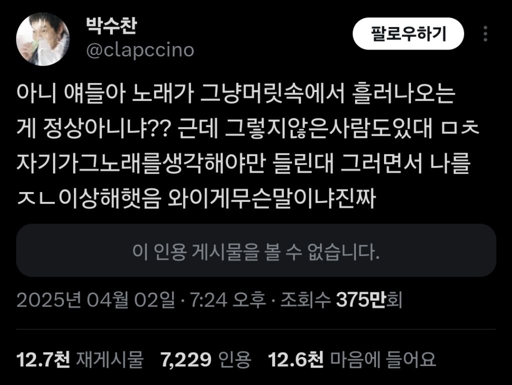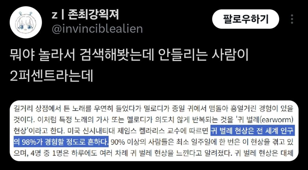 작성시간 25.04.06 헐 뭐가 들린다는거야?? 머리속에서 재생이 된다고???