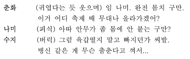 수지 야, 하춘화. 너 얘 좋아하냐? 어? 레즈비언?