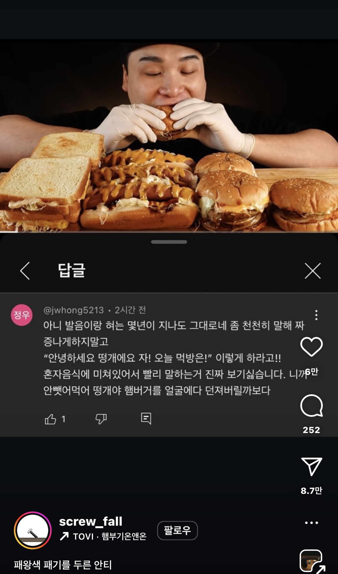 [흥미돋]안녕하세요 떵개에요 자! 오늘 먹방은! 작성자Ever|작성시간25.04.08|조회수10,404 목록 댓글 24 글자크기 작게가 글자크기 크게가 출처: 여성시대 Ever너무해 ㅅㅂ ㅠㅠㅠㅋㅋㅋㅋㅋㅋㅋㅋㅋ 다음검색 현재 게시글 추가 기능 열기 북마크 공유하기 신고 센터로 신고 댓글 댓글 24 댓글쓰기 답글쓰기 댓글 리스트 작성자조카밥 | 작성시간 25.04.08 아나 얘 먹방 안 봐서 궁금해서 쳐봤는데 광기 미쳤낰ㅋㅋㅋㅋㅋㅋㅋㅋ 이미지 확대 답댓글 작성자에엥???!? | 작성시간 25.04.08 ㅅㅂ존나룻곀ㅋㅋㅋㅋㅋㅋㅋ 작성자분말고추는 무슨말씀인지 잘 | 작성시간 25.04.08 하 ㅋㅋㅋㅋ 작성자스윙칩빨간오뎅맛 | 작성시간 25.04.08 왜 저렇게까지 악플을..ㅋㅋㅋ ㅠㅠ 작성자까까런 | 작성시간 25.04.09 ㅋㅋㅋㅋㅋㅋㅋㅋㅋㅋㅋㅋㅋㅋㅋㅋ 댓글 전체보기