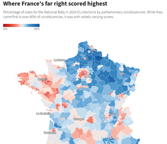 [파리와 대도시에서는 지지율이 낮으나, 과거 프랑스 제조업의 중심이었던 북서부 지역에서는 지지율이 60%에 육박]