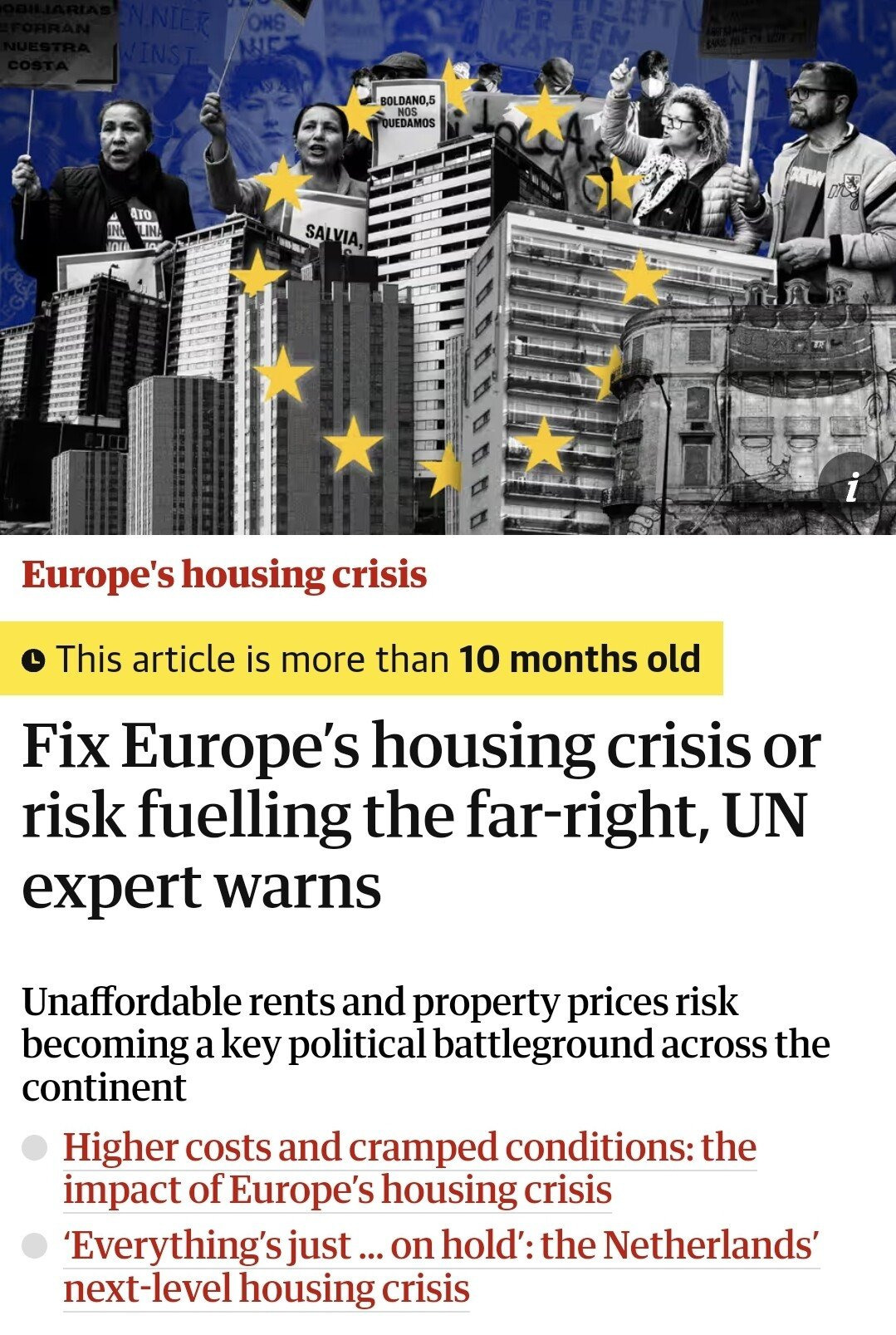 [ 유엔 : 유럽은 대도시 월세가 월급 40-50% 가는 월세폭등 문제 해결 못하면 극우물결 볼 거임 ]