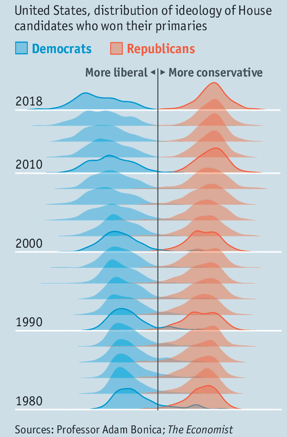 [ 1980년대 이후 2018년까지 정치적 양극화: 1990년대 이후 특히 심해짐 ]