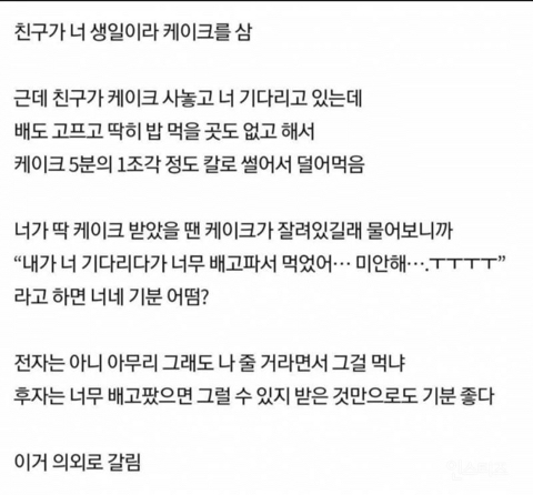 작성시간 25.04.13 존나 웃김ㅋㅋㅋ 어차피 나눠먹을거 잘 먹었다 케이크 사줘서 땡큐 더 먹을래??