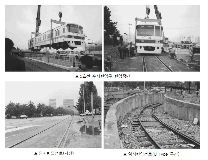 도로 위에 임시로 부설한 철로를 이용해서