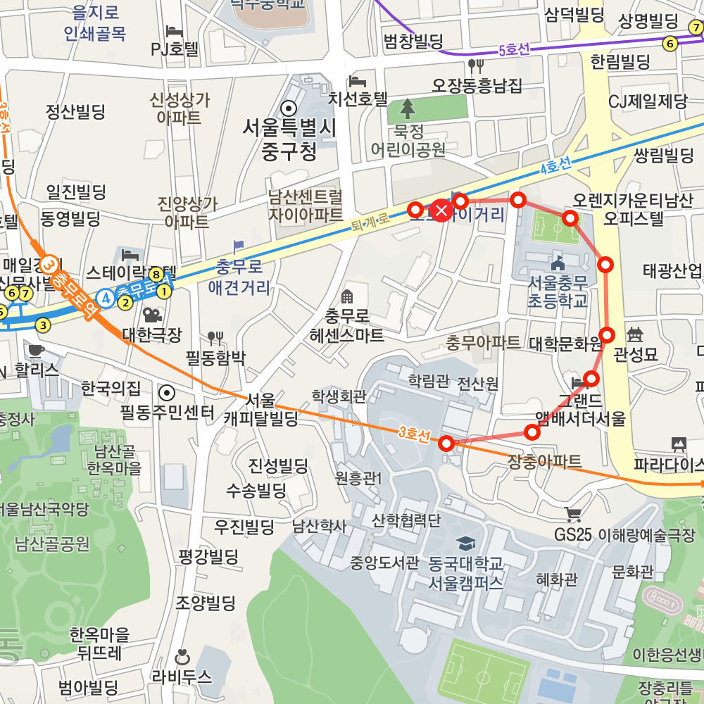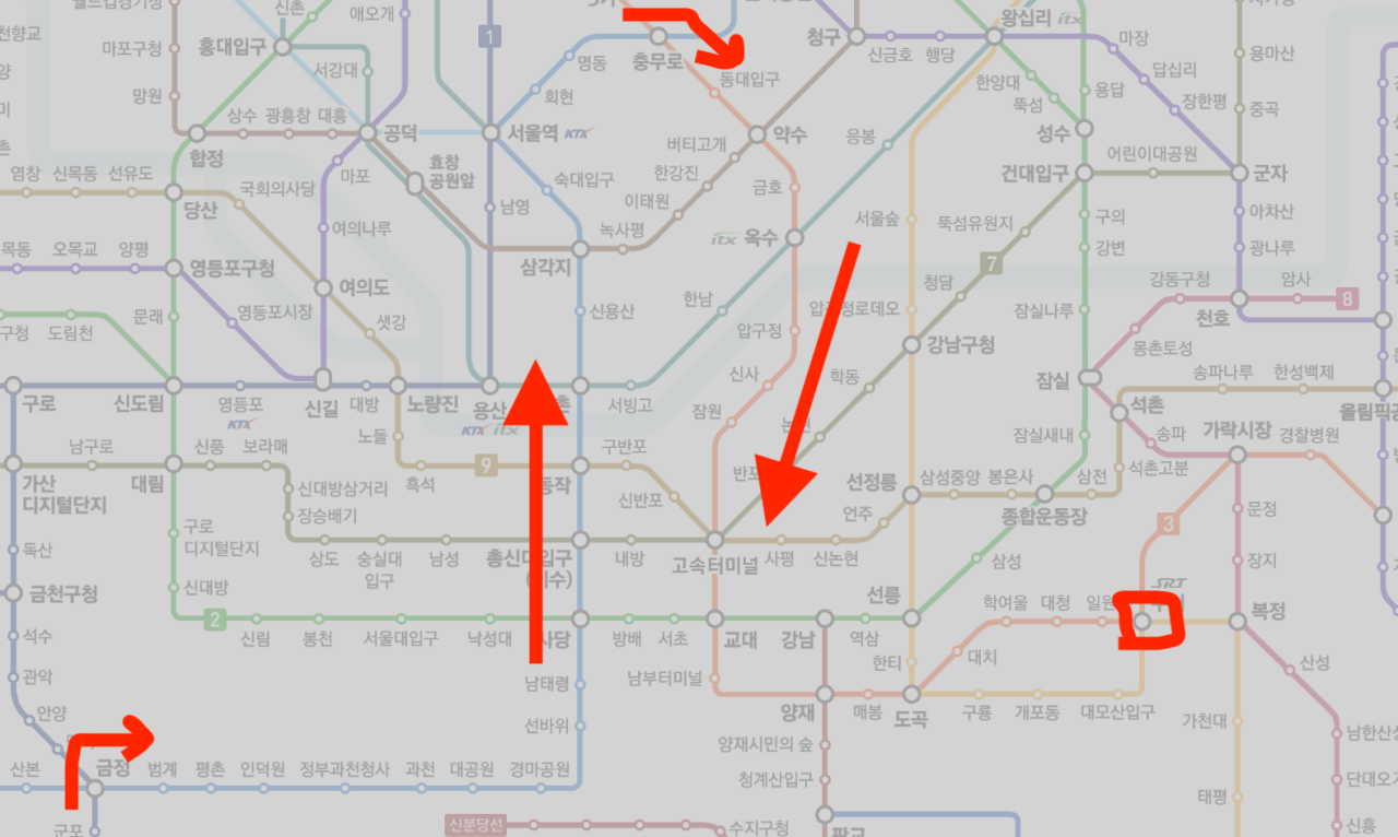 금정에서 4호선, 충무로에서 3호선을 이용해