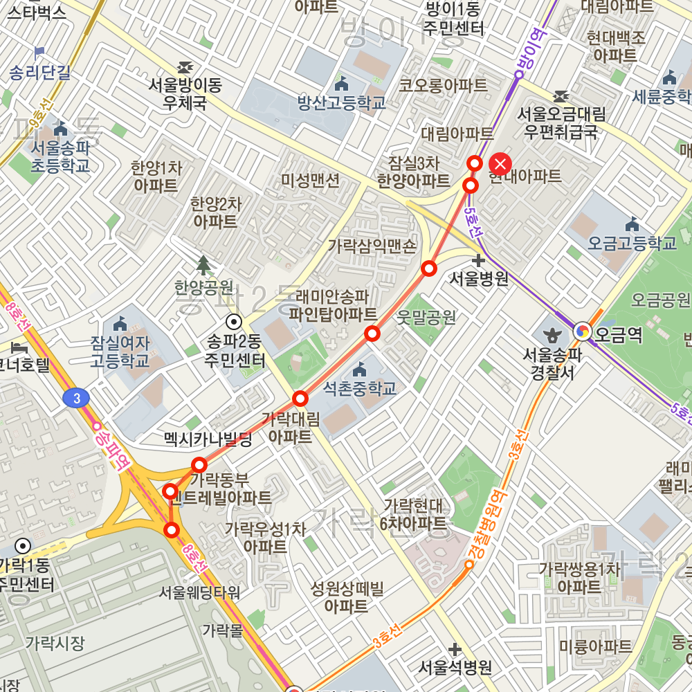 가락시장역과 방이역 사이에