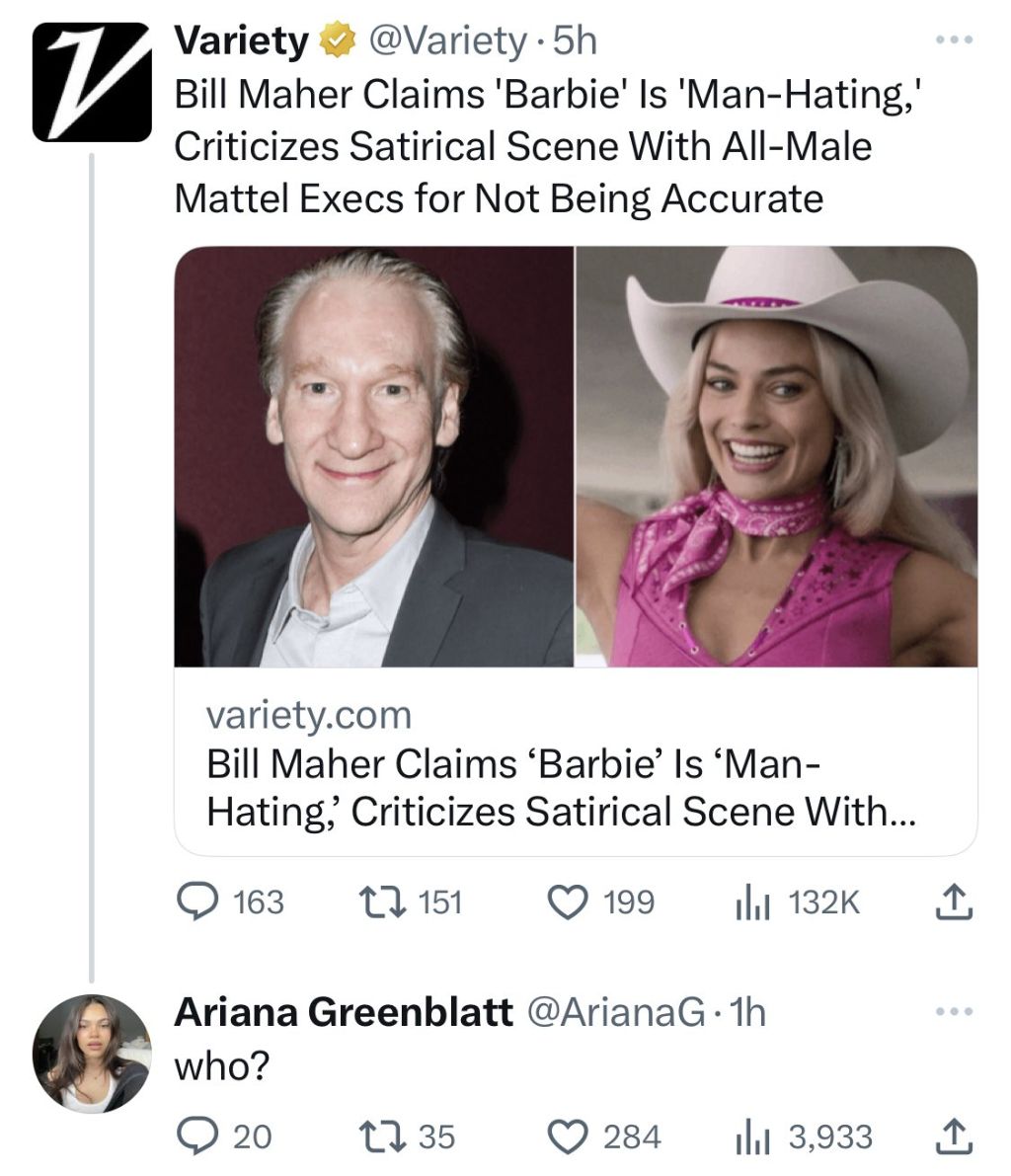 빌 마허(누군지모름)가 '바비는 남성혐오 영화이고 Mattel 남성 간부들 장면은 정확하지 않은 풍자적 장면이라고 비판했다'는 기사에