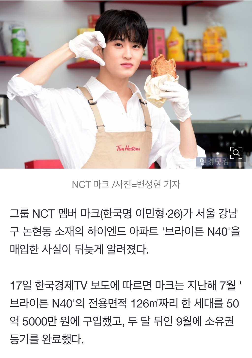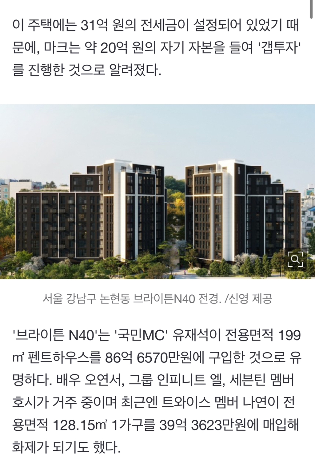 [여시뉴스데스크]'26세' NCT 마크, 논현동 '브라이튼 N40' 50억에 구입 [집코노미-핫!부동산] 작성자즙짜면뒤진다했지|작성시간25.04.18|조회수9,715 목록 댓글 43 글자크기 작게가 글자크기 크게가 출처: https://n.news.naver.com/article/015/0005120601?sid=101'26세' NCT 마크, 논현동 '브라이튼 N40' 50억에 구입 [집코노미-핫!부동산]그룹 NCT 멤버 마크(한국명 이민형·26)가 서울 강남구 논현동 소재의 하이엔드 아파트 '브라이튼 N40'을 매입한 사실이 뒤늦게 알려졌다. 17일 한국경제TV 보도에 따르면 마크는 지난해 7월 '브라이n.news.naver.com이하생략 다음검색 현재 게시글 추가 기능 열기 북마크 공유하기 신고 센터로 신고 댓글 댓글 43 댓글쓰기 답글쓰기 댓글 리스트 작성자카이옌 | 작성시간 25.04.18 이미지 와장창이네 내국인 갭투자도 별론데 외국인 갭투자라니 ㅎ 작성자솔로탈출 | 작성시간 25.04.18 검머외 갭투자라 작성자프로토콜프롬 | 작성시간 25.04.18 깬다 작성자두두두다다닥 | 작성시간 25.04.19 ㅇ하… 작성자돈 마니 벌게요 | 작성시간 25.04.19 와 돈 좋아하나바 댓글 전체보기