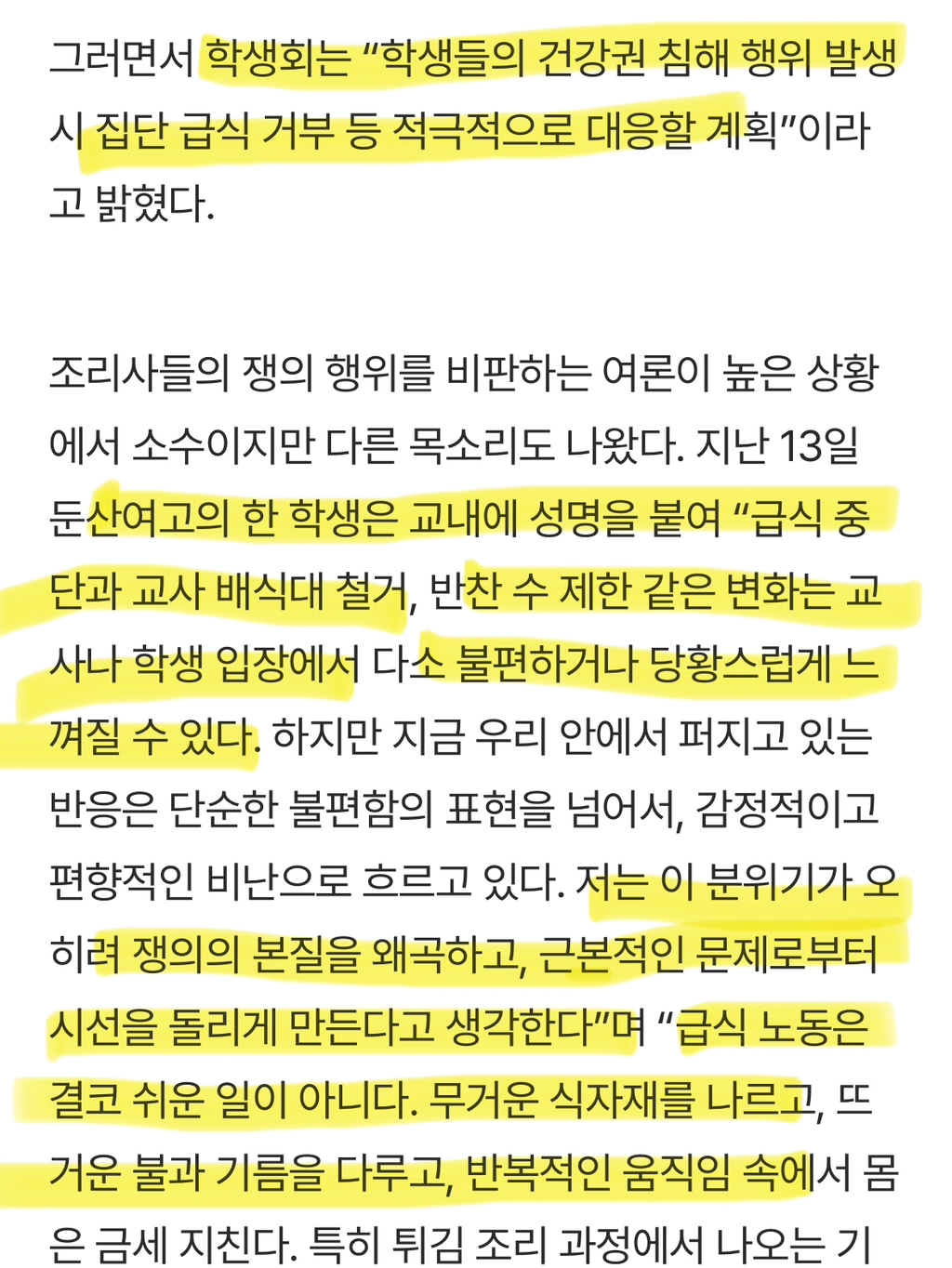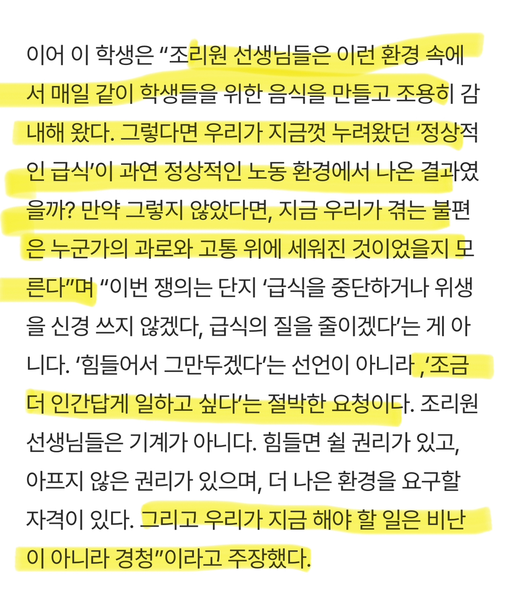 조리사들의 인력 충원 요구를 교육청이 수용하지 않는 상황에서 조리사들이 업무 강도라도 낮추려 제시한 ‘냉면그릇 사용 횟수 제한’, ‘뼈(족발·사골) 삶는 조리법 제한’, ‘전·구이·튀김 등 기름 사용하는 음식 횟수 제한’ 등을 놓고 부정적인 여론이 높아진 가운데, 해당 학교의 한 학생이 “조리사들은 기계가 아니고, 부끄러운 건 파업이 아니라 우리의 반응”이라는 글을 써 붙여 화제다.