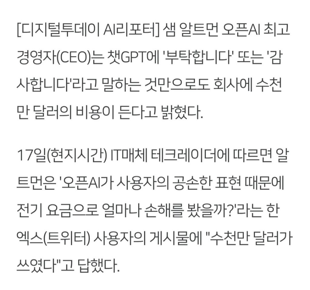 [여시뉴스데스크]샘 알트먼 "챗GPT에 '감사합니다' 할 때마다 수천만 달러 나간다" 작성자걍생러|작성시간25.04.20|조회수44,778 목록 댓글 83 글자크기 작게가 글자크기 크게가 출처: https://www.digitaltoday.co.kr/news/articleView.html?idxno=562299샘 알트먼 "챗GPT에 '감사합니다' 할 때마다 수천만 달러 나간다" - 디지털투데이 (DigitalToday)[디지털투데이 AI리포터] 샘 알트먼 오픈AI 최고경영자(CEO)는 챗GPT에 \'부탁합니다\' 또는 \'감사합니다\'라고 말하는 것만으로도 회사에 수천만 달러의 비용이 든다고 밝혔다. 17일(현지시간) IT매www.digitaltoday.co.kr 다음검색 현재 게시글 추가 기능 열기 북마크 공유하기 신고 센터로 신고 댓글 댓글 83 댓글쓰기 답글쓰기 댓글 리스트 작성자벤위쇼 | 작성시간 25.04.20 그걸 안하면 나중에 내가 죽는다고 작성자뀨리구 | 작성시간 25.04.20 어쩌라고 머리감기는 기계나만들어;; 작성자pacta sunt servanda | 작성시간 25.04.20 생각해볼 문제기는 하네 앞으로 본론만 해야지 작성자전재준여시 | 작성시간 25.04.20 어쩌라고 씨뱅아 ㅎㅎ 드럽게 징징거리네 답댓글 작성자아이스민초호록 | 작성시간 25.04.21 ㅋㅋㅋㅋㅋㅋㅋㅋㅋㅋㅋㅋ아니 이여시 말투가 넘 웃기네... 댓글 전체보기
