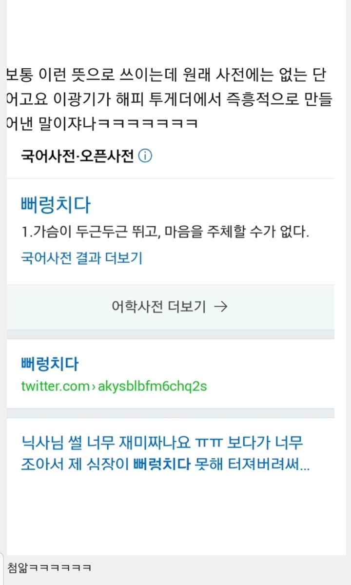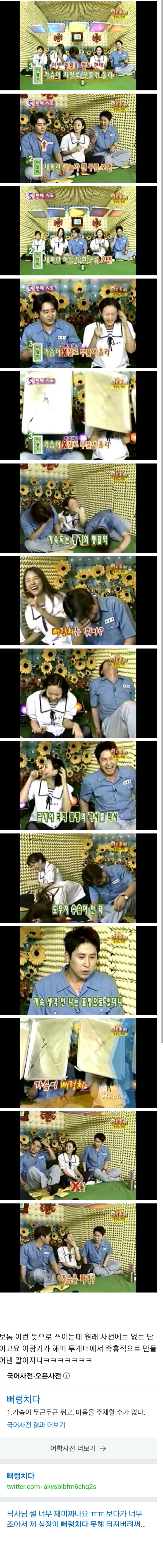 [스크랩] [흥미돋]'뻐렁치다' 의 어원 작성자on cloud 9|작성시간25.04.20|조회수3,374 목록 댓글 9 글자크기 작게가 글자크기 크게가 출처 : https://hygall.com/203792520 다음검색 스크랩 원문 : *여성시대* 차분한 20대들의 알흠다운 공간 현재 게시글 추가 기능 열기 북마크 공유하기 신고 센터로 신고 댓글 댓글 9 댓글쓰기 답글쓰기 댓글 리스트 작성자법무법인세종 | 작성시간 25.04.20 헐 이거였어?ㅋㅋㅋ 작성자햄스터꼬리곰탕 | 작성시간 25.04.20 가슴이 저절로 뻐렁쳐올라 ~ 즈으//흙어워 즐거워 노래불러요 작성자왈왈히 | 작성시간 25.04.20 아니 진짜로..? 이광기가 저렇게 한 것도 알긴 했는데 저때 생성이 됐다고????? 신기.. 작성자파란니트 | 작성시간 25.04.20 죽을때까지 못잊어 진짜저거 본방보면서 처음으로 웃다가 배찢어져 죽는줄 알앗음ㅜ 작성자프로혼닭러 | 작성시간 25.04.20 ㄹㅇ? 댓글 전체보기