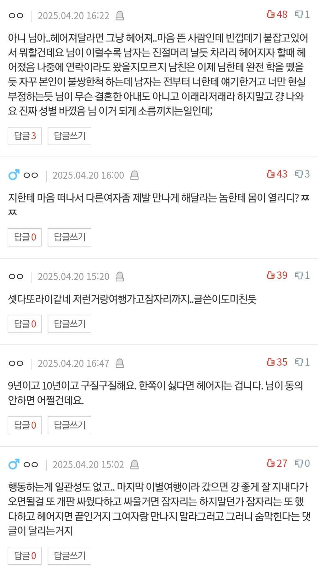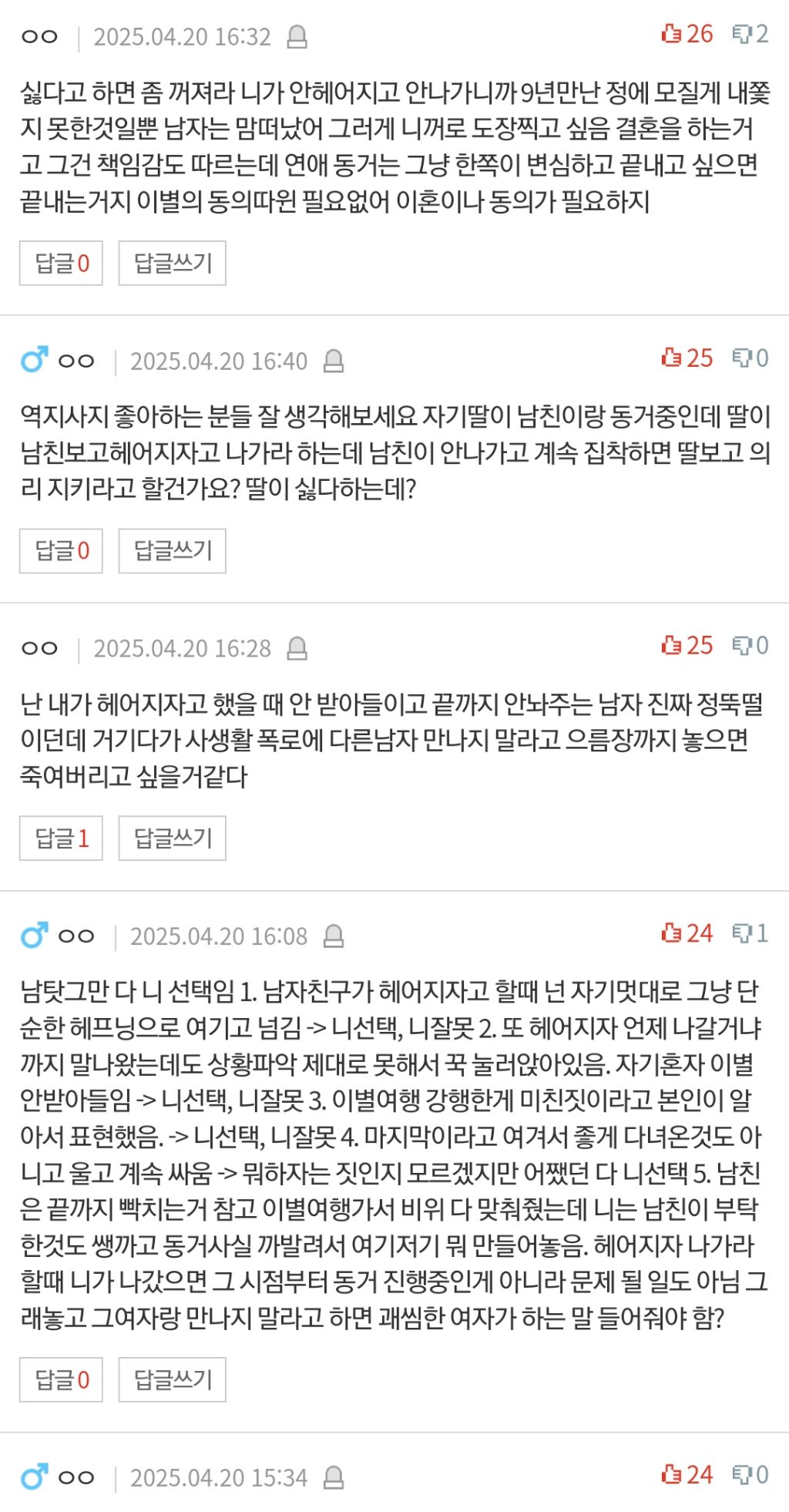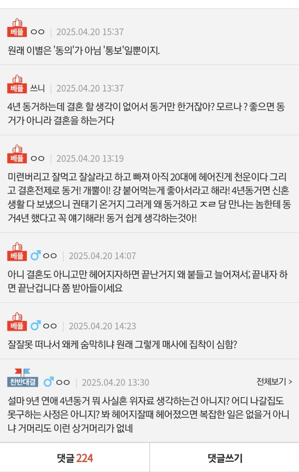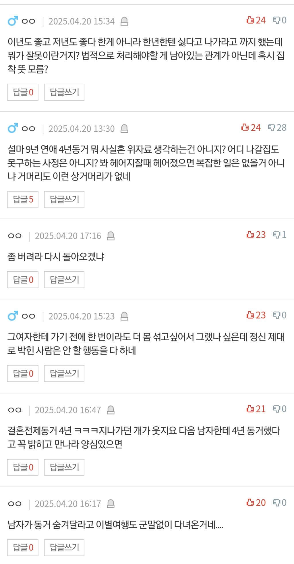 답댓글 작성자먹고 눕지말래서 누워서먹어요 작성시간 25.04.21 22222 4년을 동거하고 첫 집은 여자가 대출받아서 살았으면서 갑자기 하루아침에 집구해서 나가라? 빨리 갈라서고 싶으면 남자가 나가는게 맞지