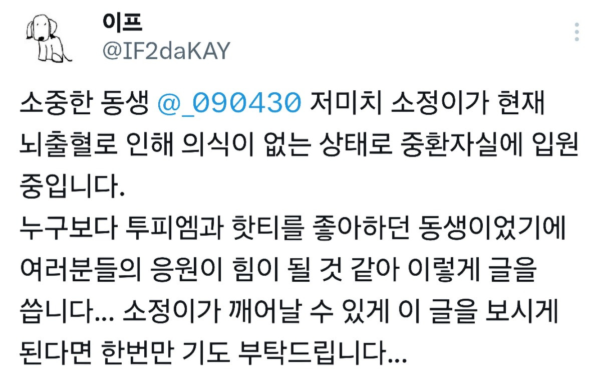 그녀가 일어나길 기도했고 이를 투피엠 멤버들도 알게 됨