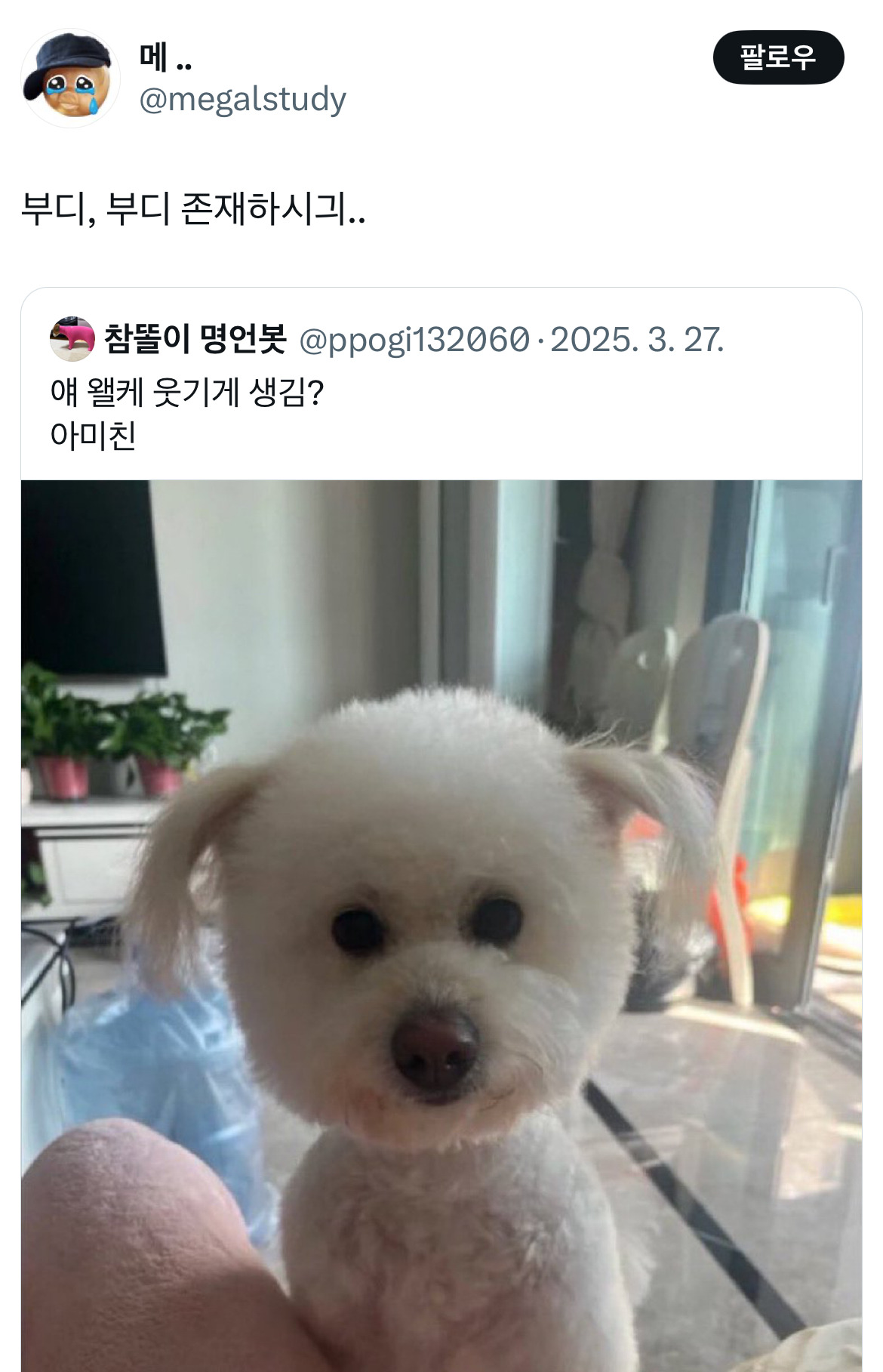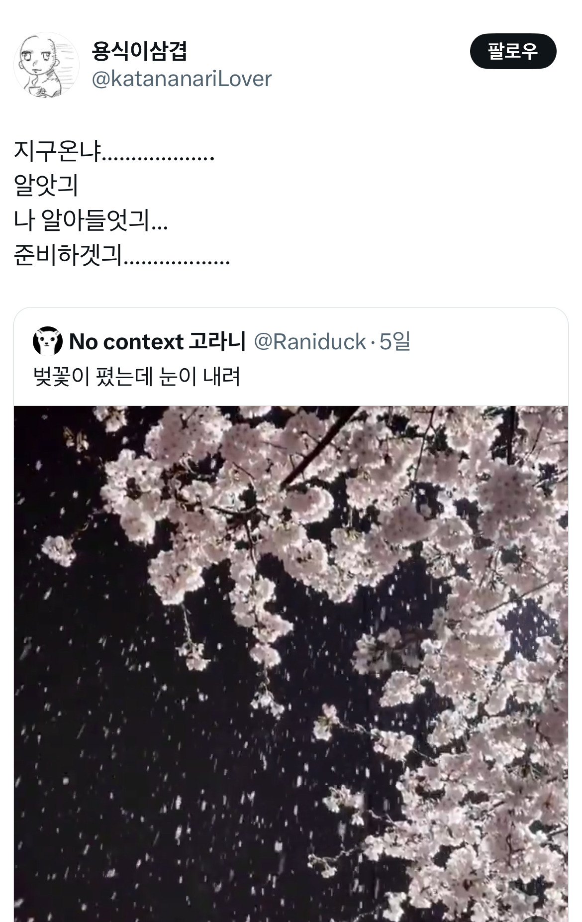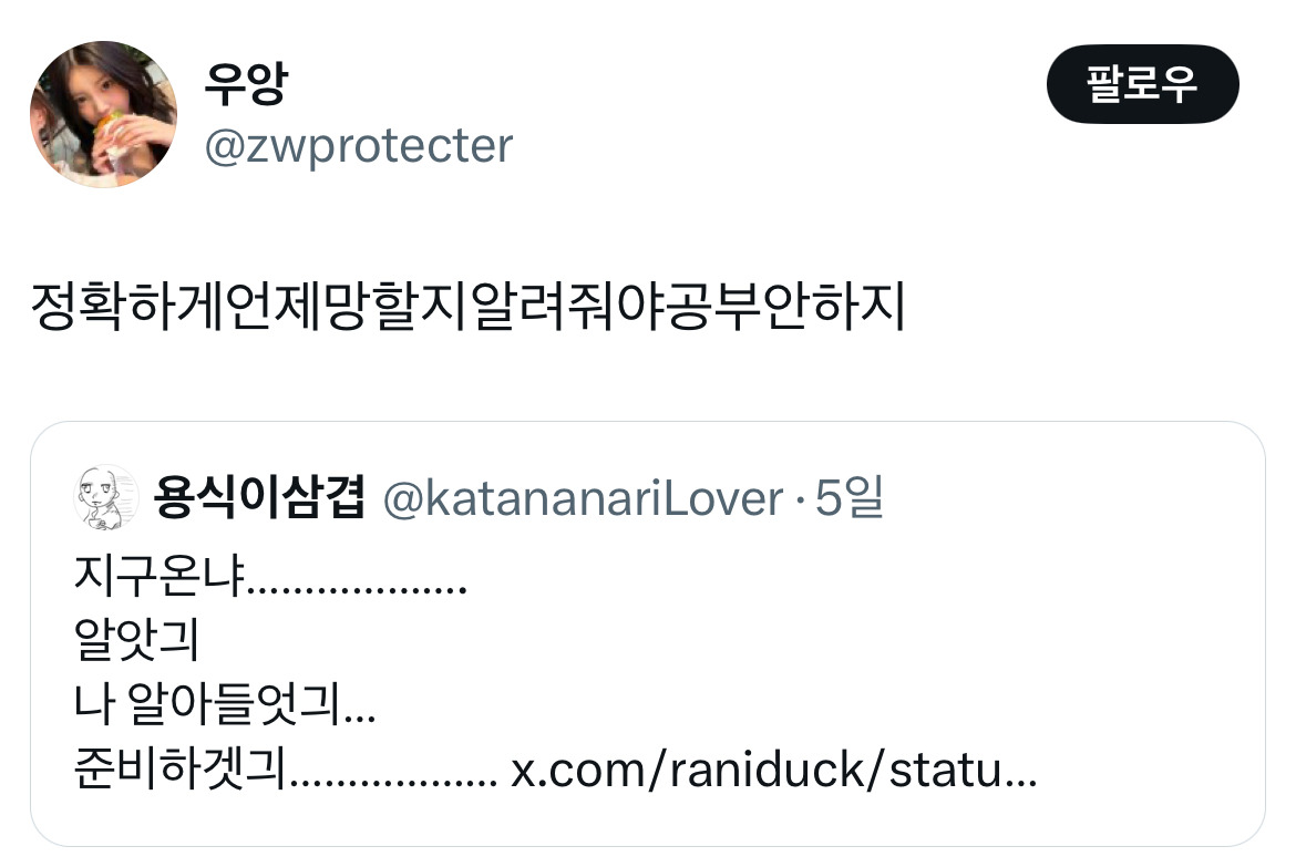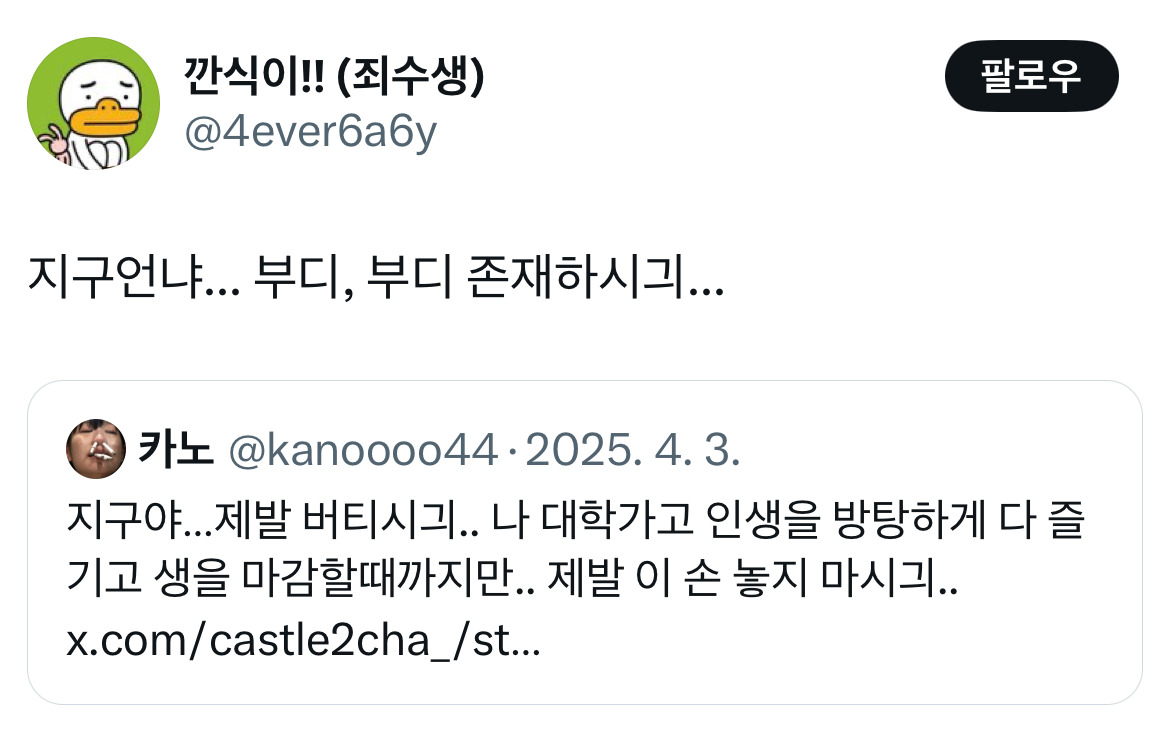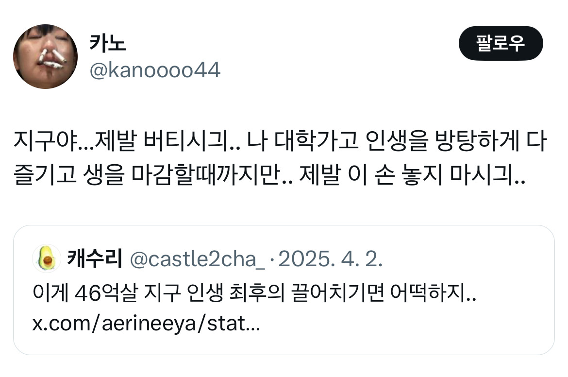 작성자피개행개 작성시간 25.04.21 지구온냐...나 알아들엇긔... 가 웃겨서 미치겠긔ㅠ