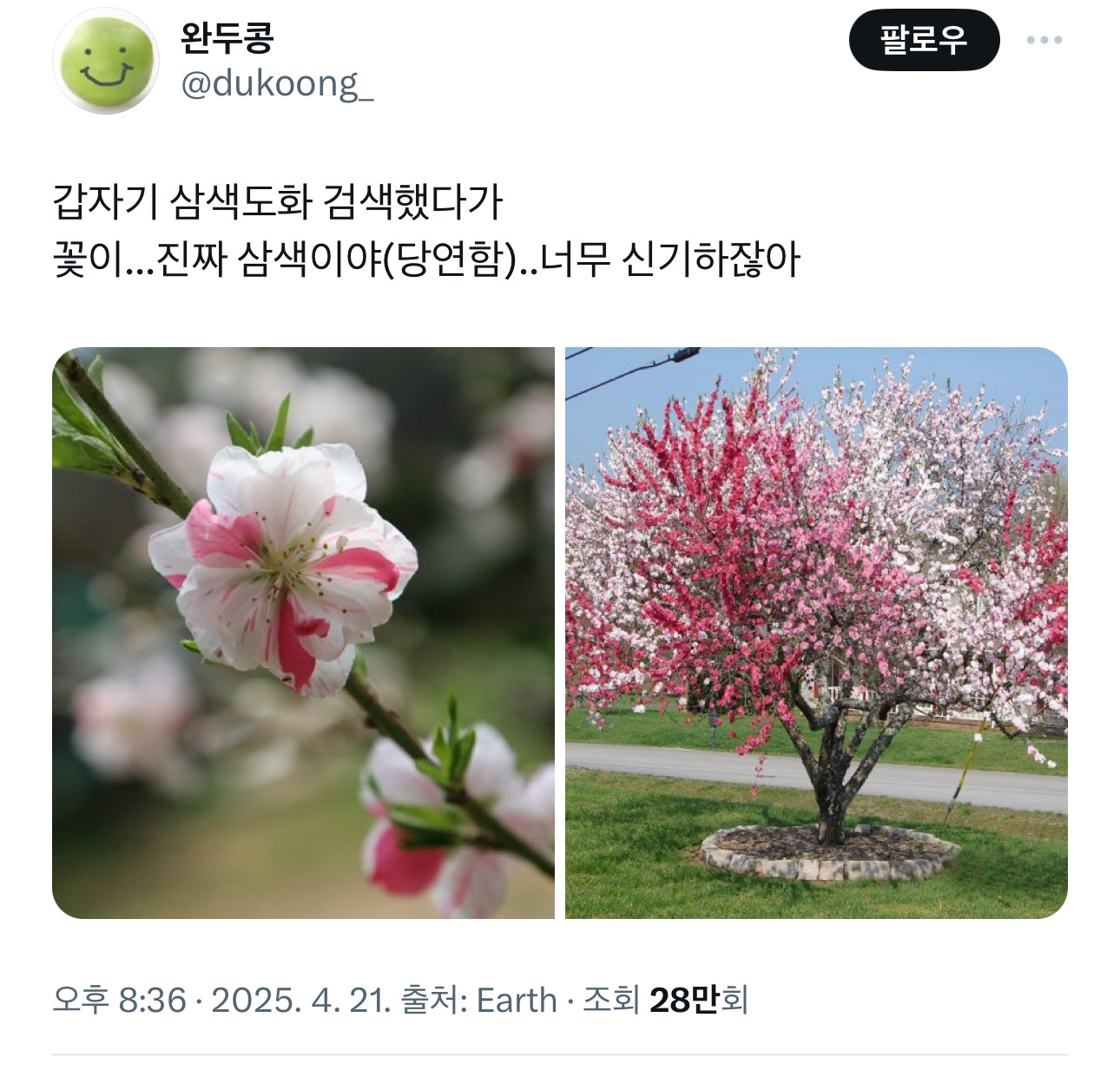 같은 나무, 그것도 한 가지에 붉은색, 흰색, 분홍색의 꽃이 동시에 핀다면 보통 개량종이라고 생각하기 쉽지만, 삼색도화(三色桃花)는 아주 예전부터 있었던 자연 품종이다.