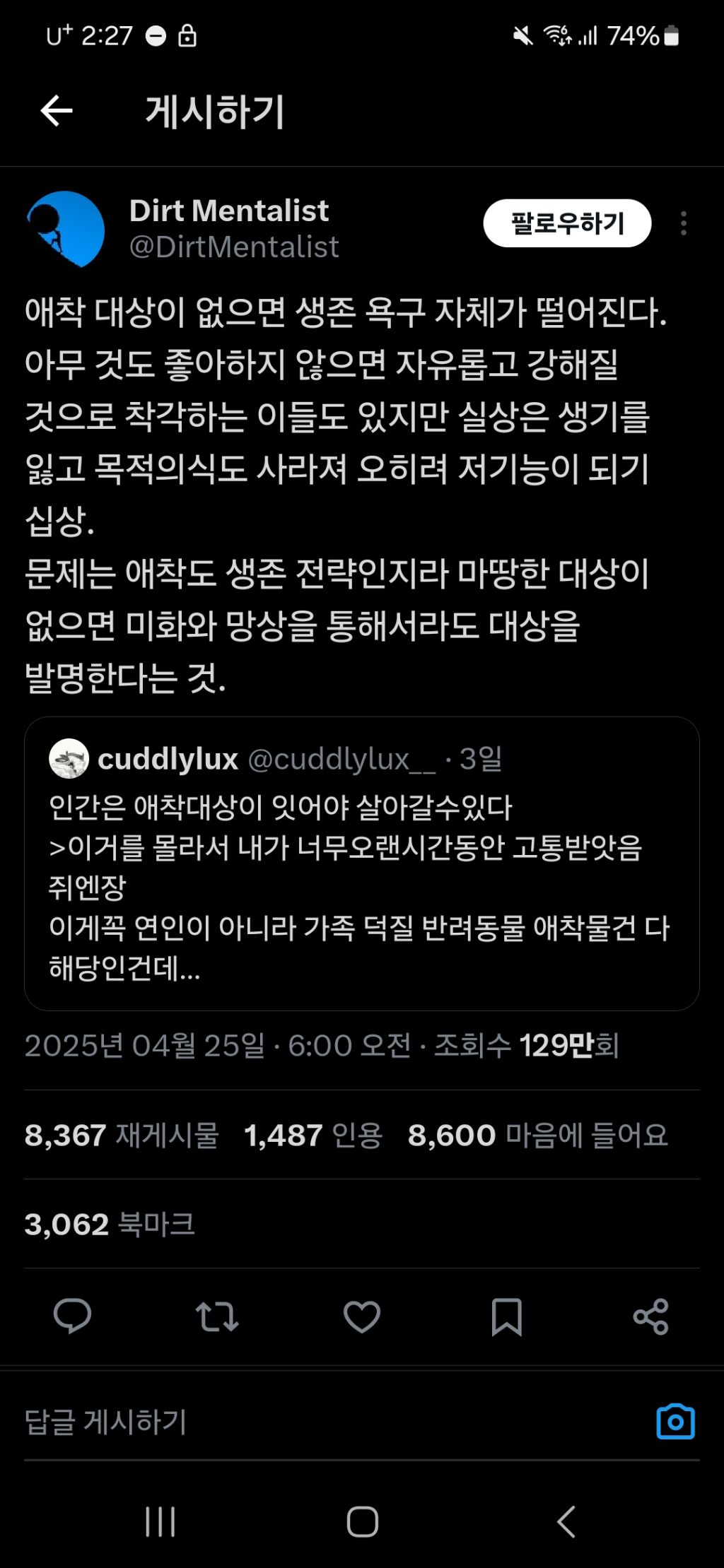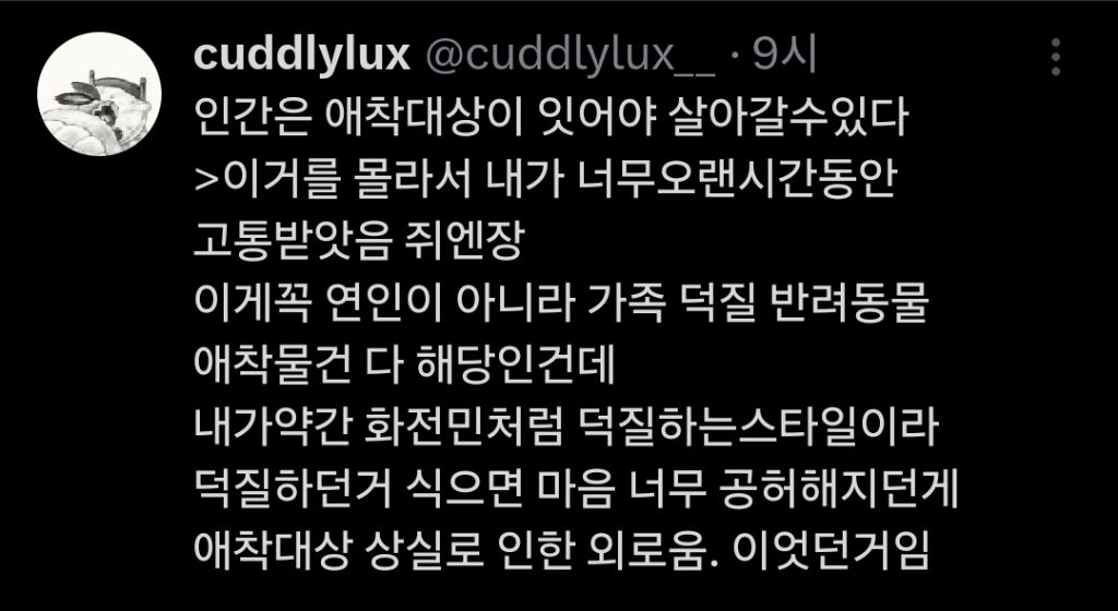 작성시간 25.04.26 반려동물이 인생의 구원자가 되는 이유이자, 아무리 힘들어도 아이없는 생활로 돌아가지 않는다는 부모들의 마음이 여기서 오는 가봐.. 애착대상. 살아야 할 이유 그 자체