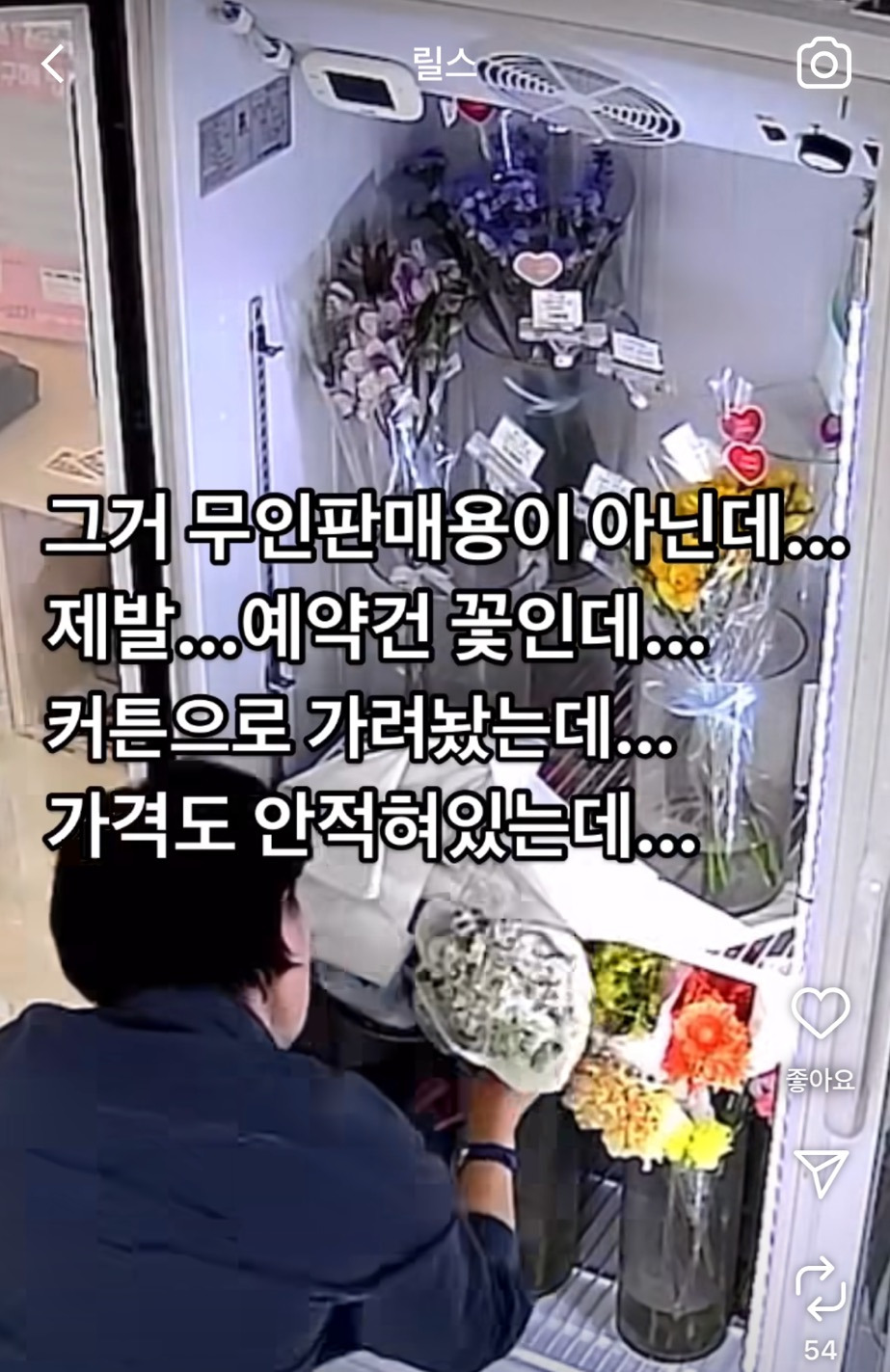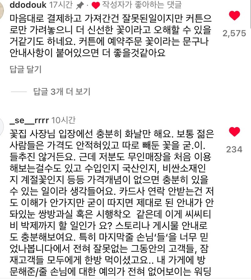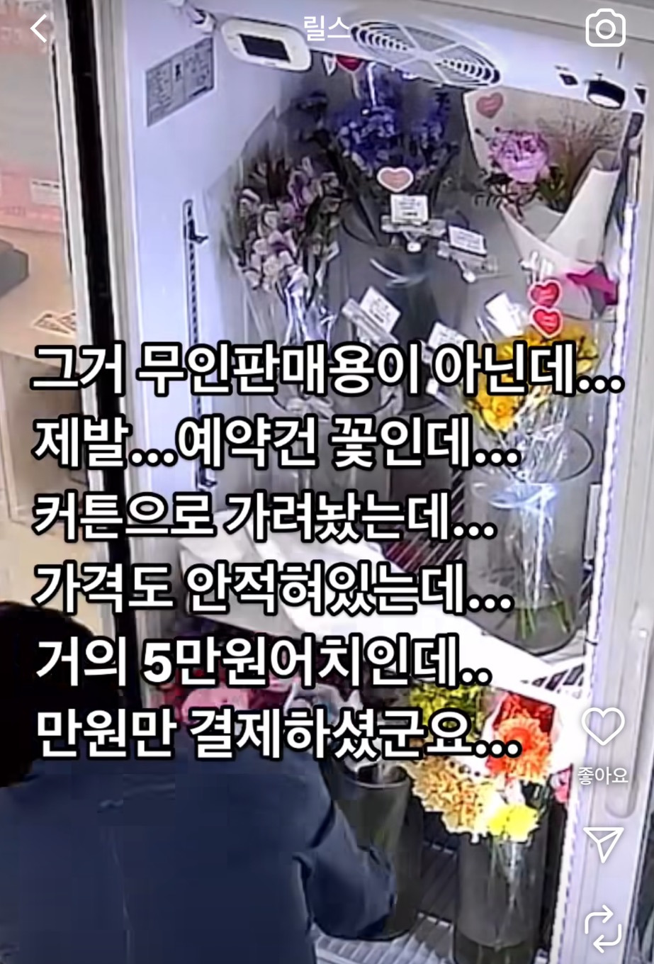 작성자탁한눈의광인 작성시간 25.05.04 댓 연어해보니까 손님도 여러개 가져가고 다른상품 바코드로 만원냈다는거보니까 완전 나쁜의도가 없엇다고 볼수는 없을거같은데 한편으론 몰라서 그랬을수도 있다는 생각듦. 반면 주인은 만약 따로 빼놓을수 없는 사정이 있어서 다른상품이랑 같이 둔거면 커튼 가리면서 예약된 꽃입니다. 구매하지 말아주세요. 두문장만 써놨어도 저상황 일어났을때 누구잘못 가릴일도 없이 그냥 손님 잘못이었을텐데 최소한의 의무도 안내도 대처도 안해놓고 카드사 전화 안받았다고 ㅇㅋ 넌 박제. 세상 사람들 이사람 욕해주세요 전시하는게 손님보다 2배는 더 이상한짓 같아