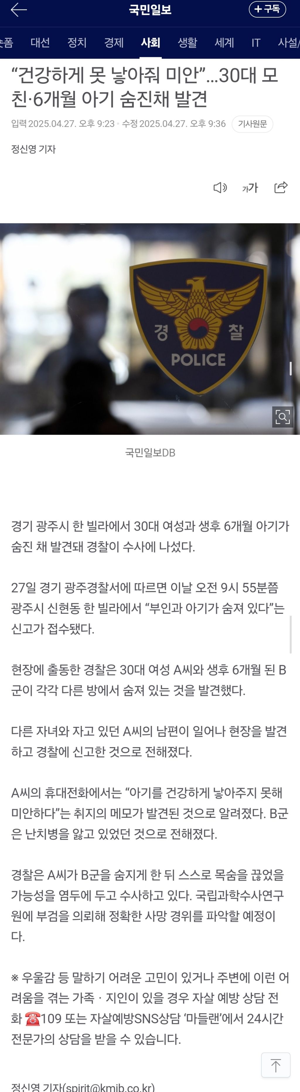 [여시뉴스데스크]“건강하게 못 낳아줘 미안”…30대 모친·6개월 아기 숨진채 발견
