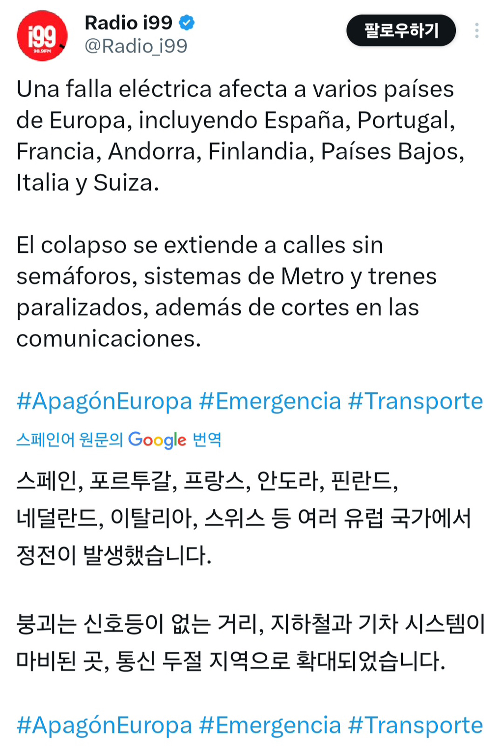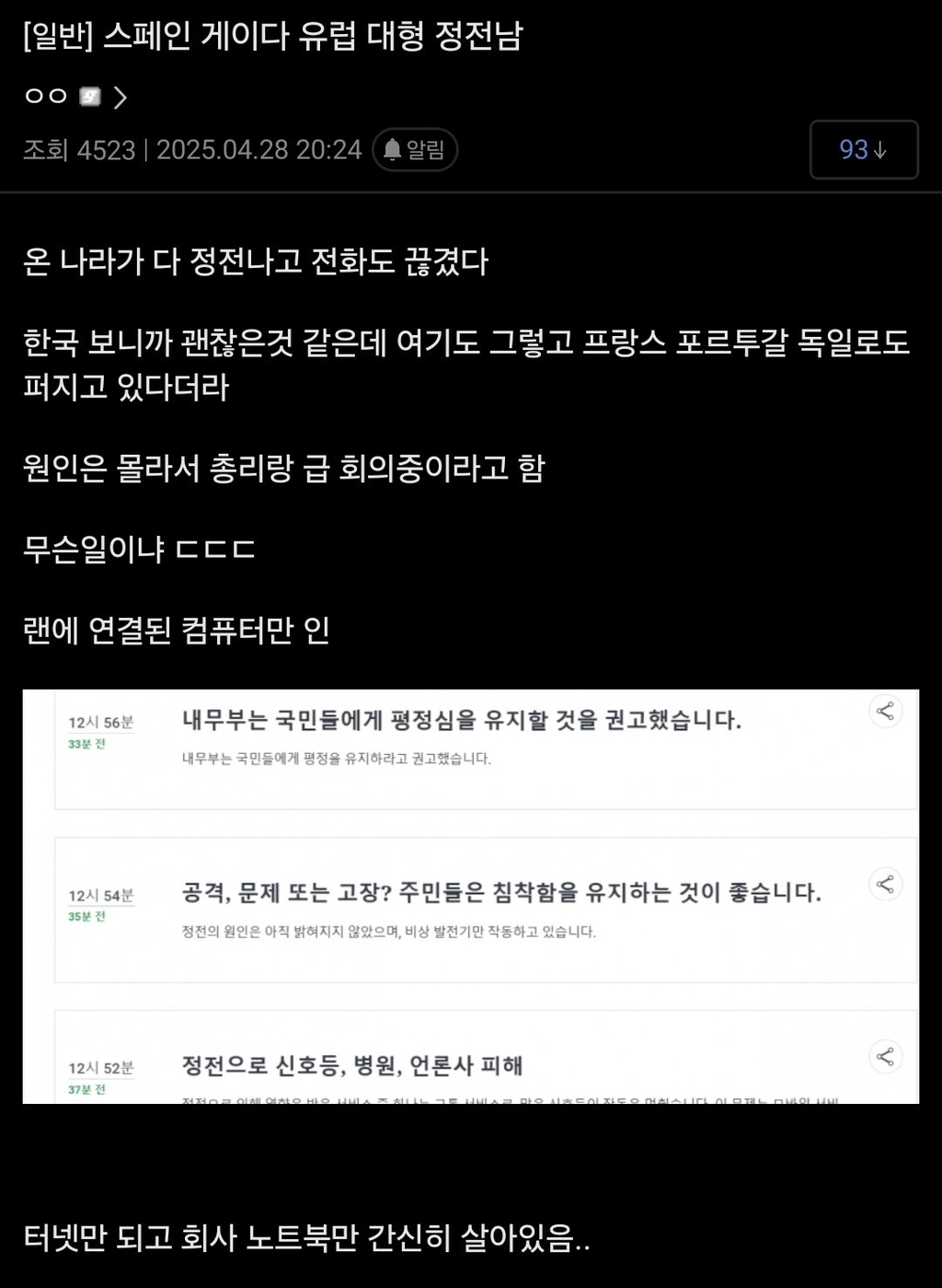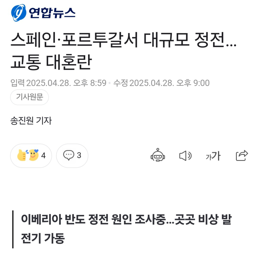 작성시간 25.05.09 저거 유튜브에서봤는데 진짜 끔찍; 식당이고 마트 이런뎊냉장고뭐고 다 꺼지고 카드기안되서 영업자체를 못하더라ㅋ 우리집도 전봇대에 까치가 앉아가지고 변압기인가뭔가ㅜ터져서 일대가 몇시간 정전됐는데 미치는줄 알았는데.. 와이파이안되고 핸드폰 충전도 안되있으니까 집에서 할수있는게 없더라 저녁시간이여서 어둑해지는데 가로등안되니까 칠흑같은 암흑;
