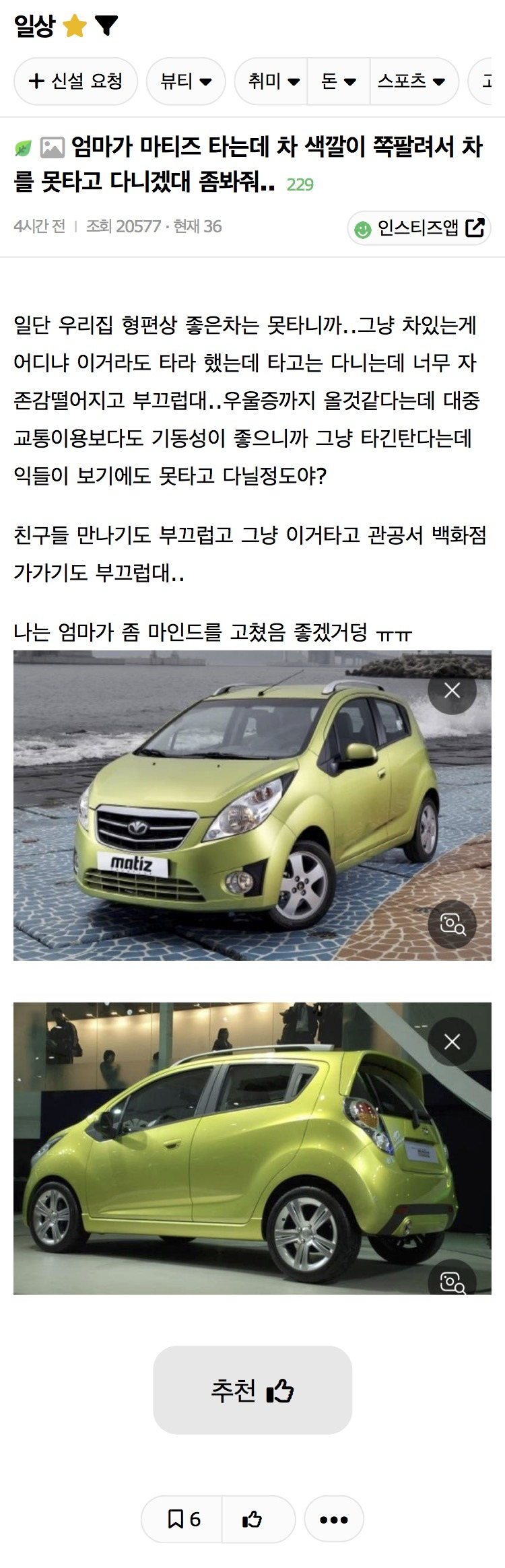 [스크랩] [흥미돋]엄마가 마티즈 타는데 차 색깔이 쪽팔려서 차를 못타고 다니겠대 좀봐줘.. 작성자안졸리나젤리|작성시간25.05.01|조회수139,048 목록 댓글 263 글자크기 작게가 글자크기 크게가 출처: https://www.instiz.net/name/59948528 다음검색 스크랩 원문 : *여성시대* 차분한 20대들의 알흠다운 공간 현재 게시글 추가 기능 열기 북마크 공유하기 신고 센터로 신고 댓글 댓글 263 댓글쓰기 답글쓰기 댓글 리스트 작성자꽁이콩이꽁 | 작성시간 25.05.08 우울증 까지 올정도면 대중교통 타시길 ㅠㅠ형편이 안되는데 우째 작성자걍걍중걍약 | 작성시간 25.05.08 돈한푼안벌어봣나보네 작성자월급조 | 작성시간 25.05.08 뭐어때없는것보다낫다 작성자고기사랑 | 작성시간 25.05.09 엄마가 돈 안벌어보신것같음 작성자반짝이게 | 작성시간 25.05.09 귀여운데 차있는게 어디야 걍 싫으면 대중교통 타면되지 아님 돈 모아서 래핑하면되구.. 댓글 전체보기