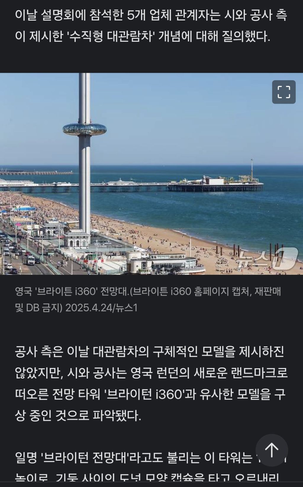 공사 측은 이날 대관람차의 구체적인 모델을 제시하진 않았지만, 시와 공사는 영국 런던의 새로운 랜드마크로 떠오른 전망 타워 '브라이턴 i360'과 유사한 모델을 구상 중인 것으로 파악됐다.