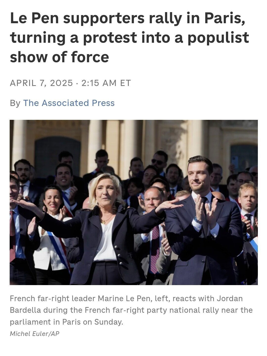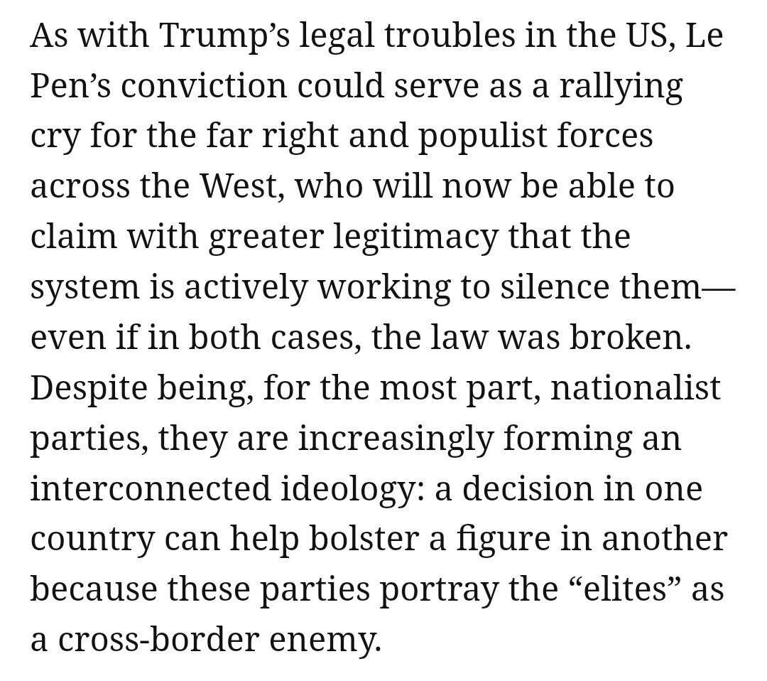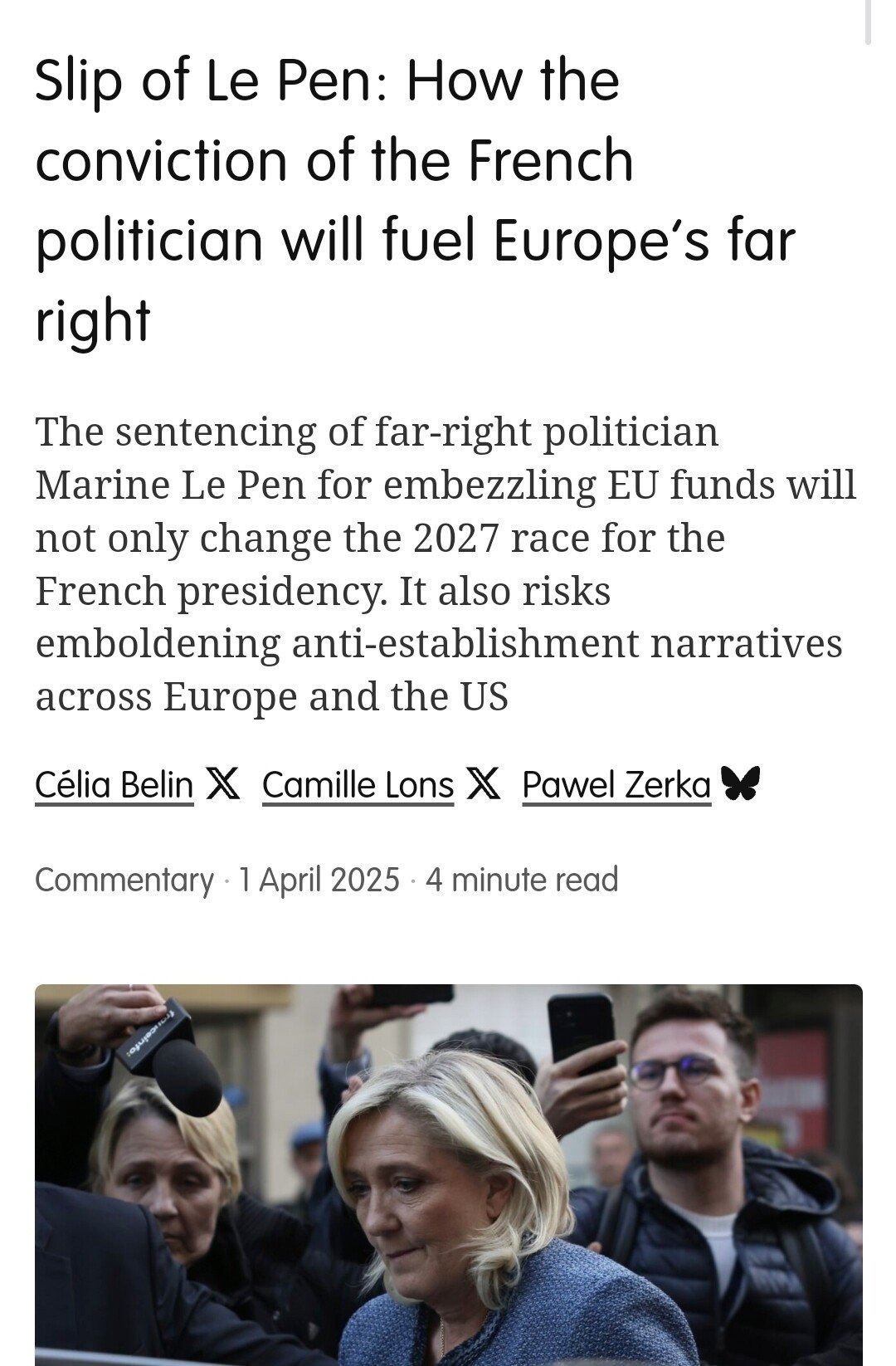프랑스 극우 정당 국민연합의 정치인 마린 르펜이 유럽연합 예산 횡령건으로 2027년 대선 출마 자격 박탈을 선고받음. 그런데 유럽외교협회 보고서에서는 단기적으로 국민연합에 타격이겠지만 유럽 극우세는 더 상승일수 있다고.