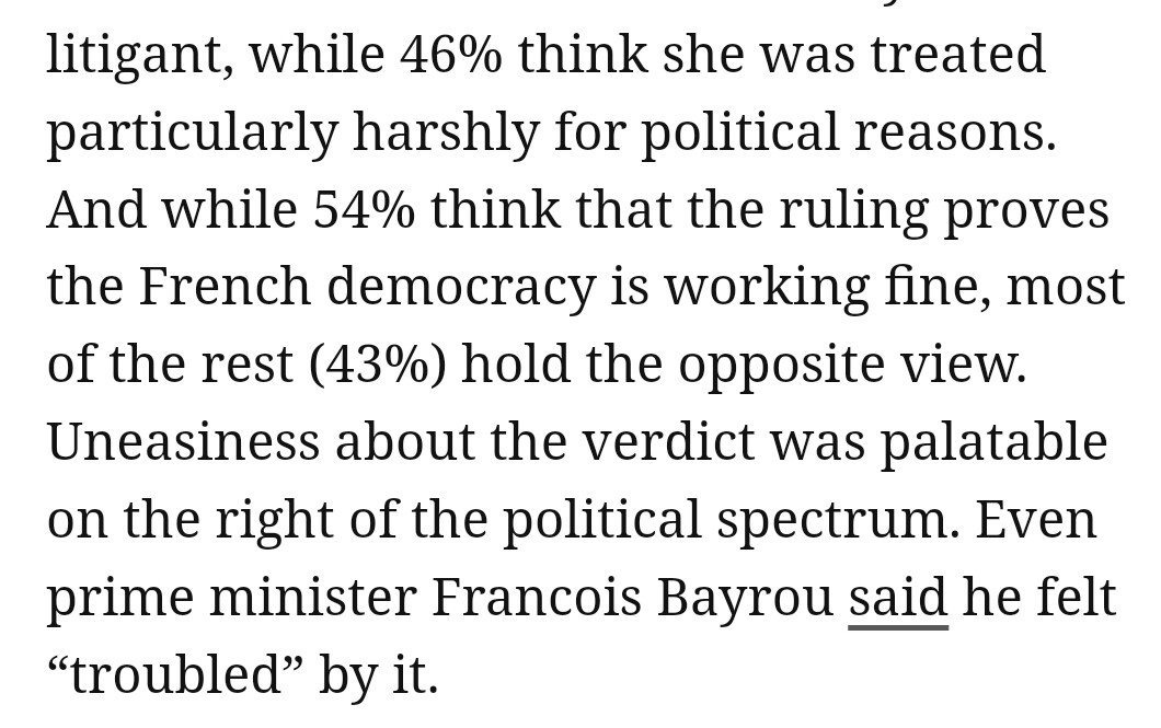 전문가들은 이게 프랑스와 유럽의 정치적 양극화가 미국만큼 심각해지는 계기를 낳지 않게 할까 우려중. 실제로 절반에 가까운 프랑스인들은 르펜이 혹독한 판결을 받았고, 프랑스 민주정은 제대로 작동하지 않는다고 답변.