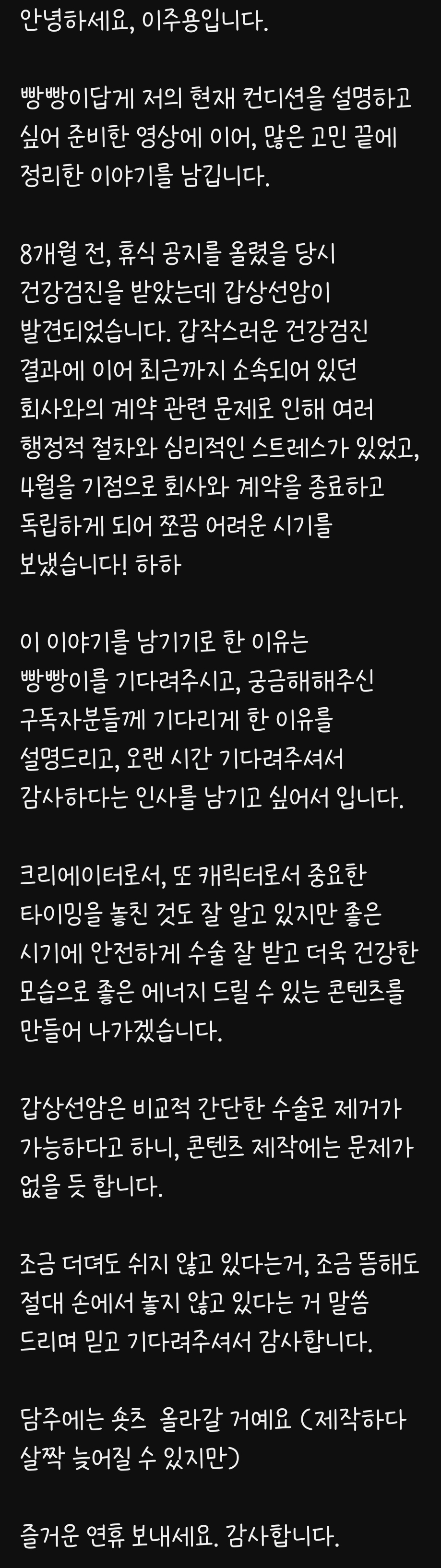 [기타]이주용 작가(빵빵이) 암 투병 공지 작성자데바데투|작성시간25.05.05|조회수79,676 목록 댓글 332 글자크기 작게가 글자크기 크게가 출처: 여성시대 데바데투 다음검색 현재 게시글 추가 기능 열기 북마크 공유하기 신고 센터로 신고 댓글 댓글 332 댓글쓰기 답글쓰기 댓글 리스트 작성자Google playboy | 작성시간 25.05.17 쩝,,ㅋ 작성자둥근해미칞거또떧내칷 | 작성시간 25.05.17 ㅇㅅaㅇ 작성자갏뵈 읺.되요 | 작성시간 25.05.18 ㅋㅋ 작성자트루하트베어 | 작성시간 25.05.18 아우 아침이네 작성자delma | 작성시간 25.05.18 아하 ㅎㅎ~ 댓글 전체보기