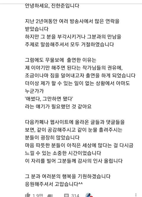 작성시간 25.05.06 댓글 멈추신이유나 다른 방송출연 거절하셨던 이유도 되게 감동이고 생각이 너무 깊으시고 좋으신 분이네...