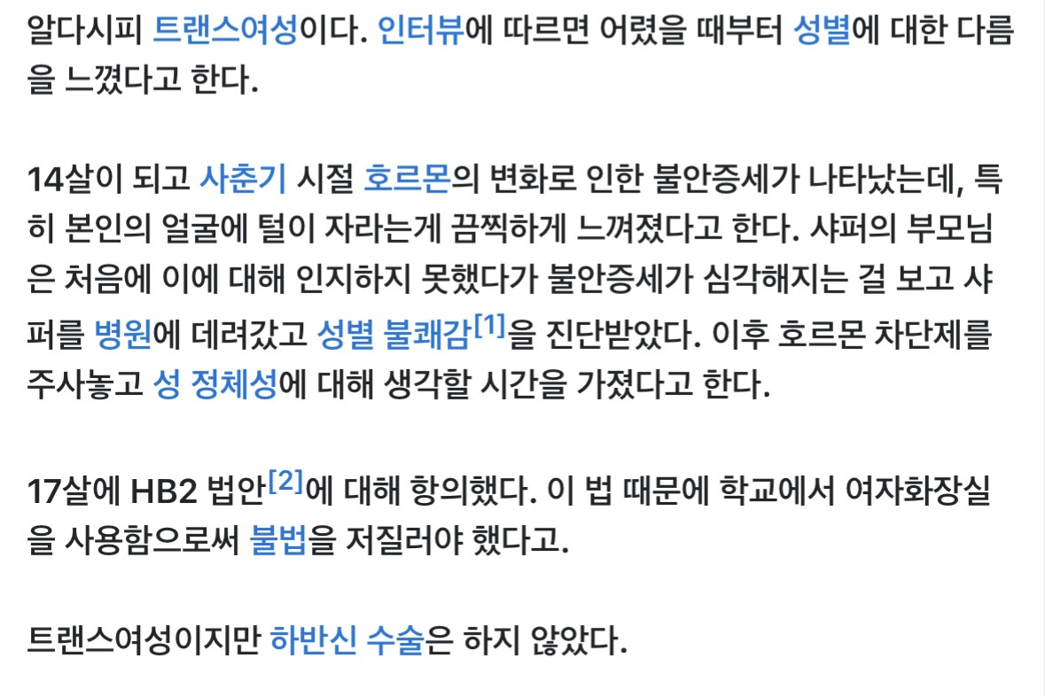 그가 트젠이 된 이유: 2차 성징 거치면서 몸에 털 나는게 트라우마 생겼다고 함…