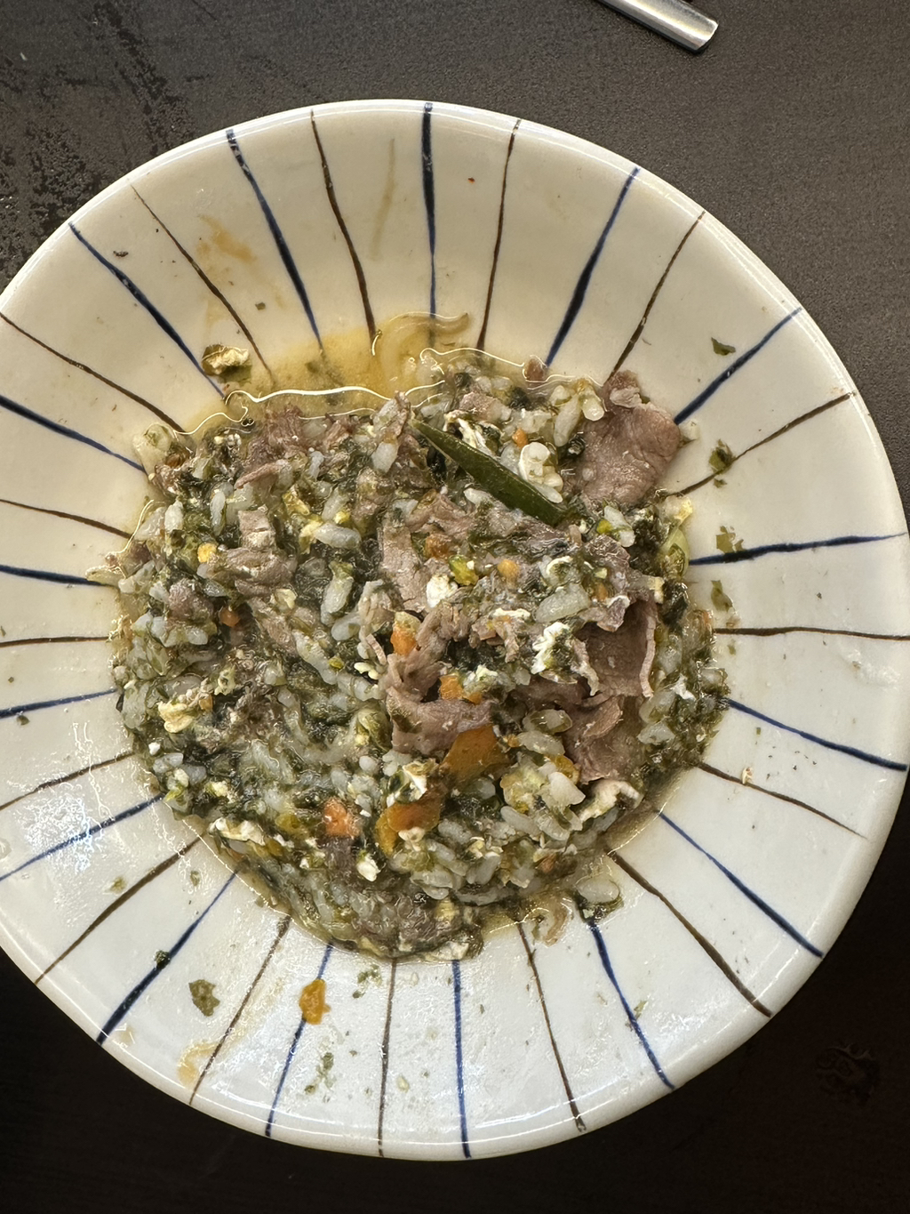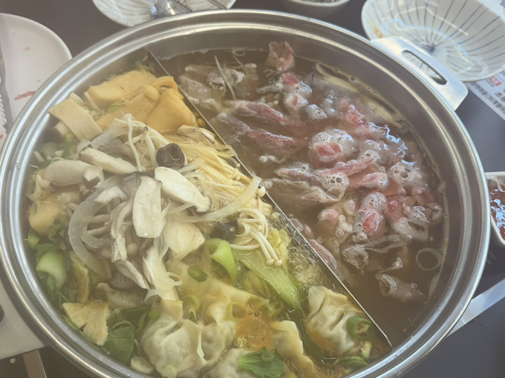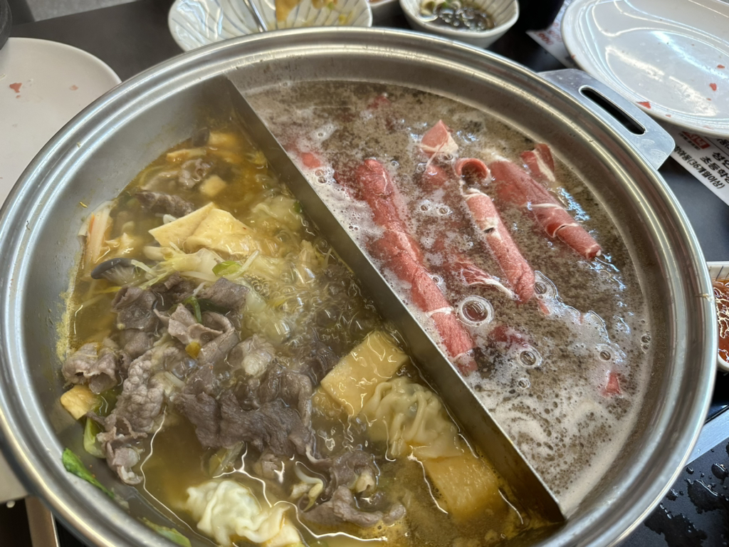 그담에 고기 익으면 고기를 왼쪽 야채 육수에 넣어서 씻어먹어..