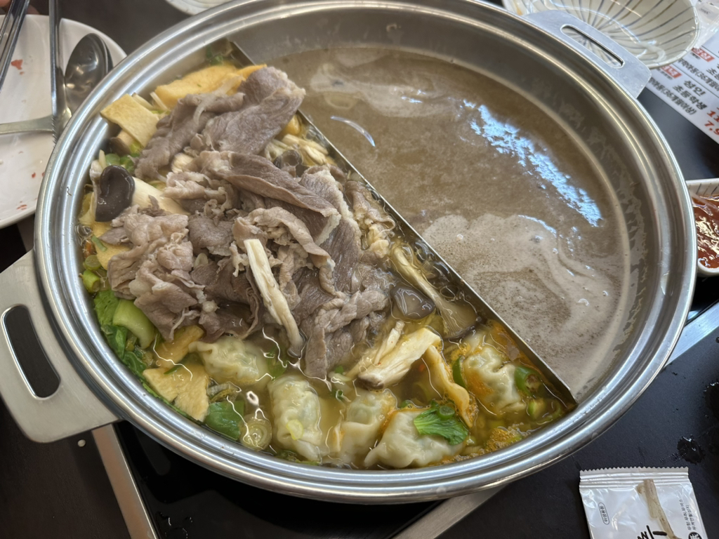 한쪽엔 야채만 넣고 한쪽엔 고기만 넣구 끓여