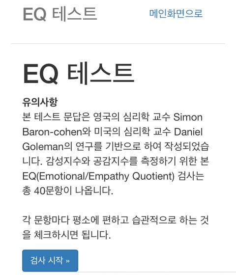 [스크랩] [흥미돋]EQ테스트 (공감/감성지수 테스트) 작성자오오오오 에에에에에에|작성시간25.05.09|조회수2,930 목록 댓글 36 글자크기 작게가 글자크기 크게가 http://eqtest.kr공감지수 감성지수 테스트야총 40문항이고 평균이 40점문제시 도망 다음검색 스크랩 원문 : *여성시대* 차분한 20대들의 알흠다운 공간 현재 게시글 추가 기능 열기 북마크 공유하기 신고 센터로 신고 댓글 댓글 36 댓글쓰기 답글쓰기 댓글 리스트 작성자우리웅이는너무귀여워 | 작성시간 25.05.09 이미지 확대 작성자나는왜안차분할까 | 작성시간 25.05.09 62 작성자poliwrath | 작성시간 25.05.09 나 한남인가;; 이미지 확대 작성자진수성찬맛나요 | 작성시간 25.05.09 와 63 작성자올리버 잭슨 코헨 | 작성시간 25.05.09 엥 나 자폐..? 이미지 확대 댓글 전체보기