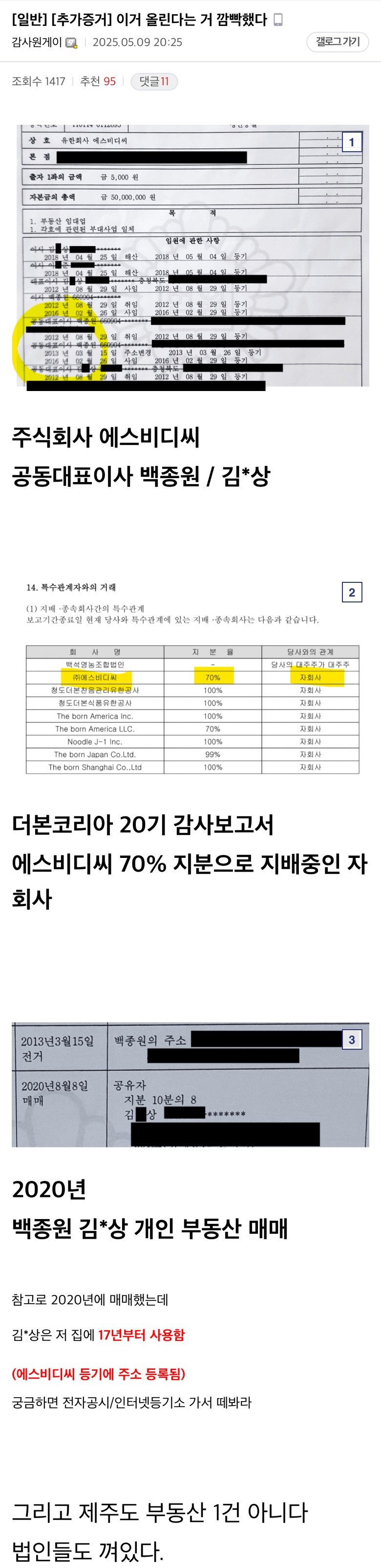 [흥미돋]백종원 새로운 의혹.jpg (더본코리아 위장계열사 의혹) 작성자크리스 마틴 게릭스|작성시간25.05.10|조회수27,447 목록 댓글 60 글자크기 작게가 글자크기 크게가 출처: 디씨요약: 세림아이앤아이라는 회사가 있는데 표면상으로는 협력회사 관계. 하지만 더본 상장후 공개된 정보에 따르면 이 회사는 더본코리아의 위장계열사로 의심되는 상황 (위장계열사가 맞을시 공정거래법 위반)+) 추가 증거 다음검색 현재 게시글 추가 기능 열기 북마크 공유하기 신고 센터로 신고 댓글 댓글 60 댓글쓰기 답글쓰기 댓글 리스트 작성자아나까나까나리까리키퍼웨이 | 작성시간 25.05.10 이젠 좀 무서울지경 작성자내맴임 | 작성시간 25.05.11 착한 척 한게 독이됐네 참…….. 아주 대박이네 작성자윌리스와그로밋 | 작성시간 25.05.11 와 뭐냐 진짜.. 작성자설탕묻힌꽈배기 | 작성시간 25.05.11 완전 무서운 사람이네;; 작성자버터비어란 | 작성시간 25.05.14 공정위, 법원이 정말 너무 우습고 하찮게 느껴졌나봄 댓글 전체보기