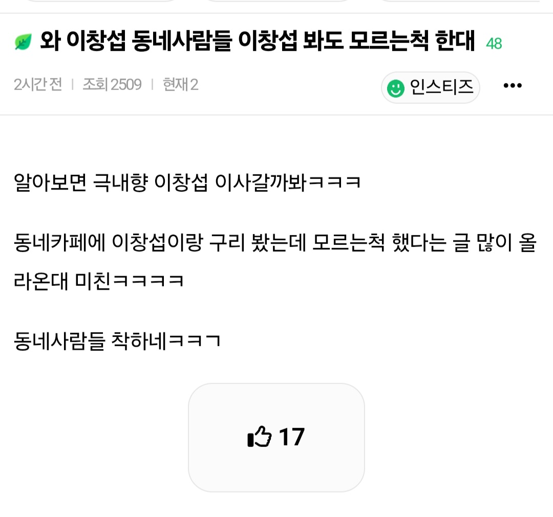 작성자bluegrass 작성시간 25.05.12 이창섭이 비투비인지 유튜브를 하는지 그런건 모를 수도 있는 거이긴 해서ㅋㅋㅋ 그냥 나혼산에 나온 낯가리는 연예인 정도로만 알고 있나봐ㅋㅋㅋㅋㅋ
