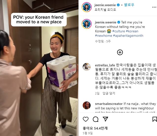 시누가 한국인인데 그래서 그런지 우리사 이사했을 때 화장지를 선물해줬어!