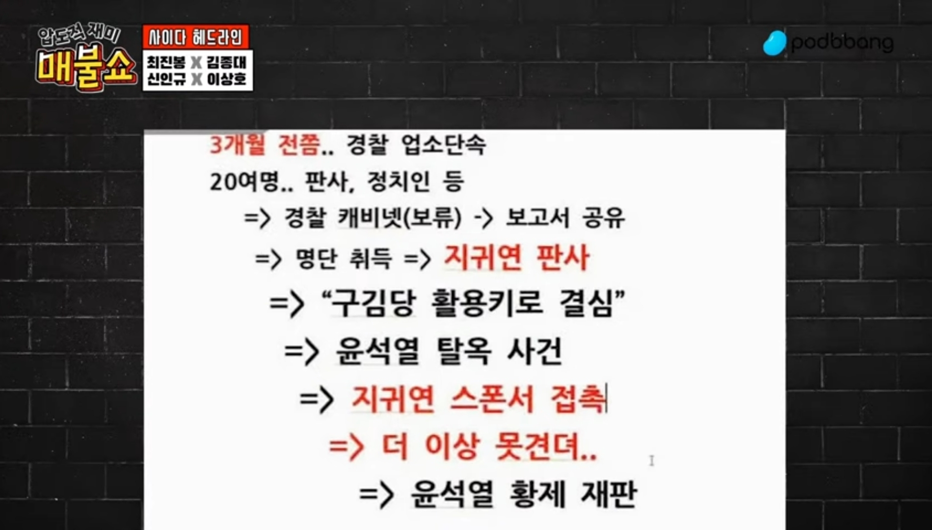 3개월 전쯤 경찰이 업소 단속 > 20여명(판사 정치인 등등) > 경찰 캐비넷으로 보류 > 보고서가 뒤로 공유되면서 명단 취득(지귀연) > 국힘이 활용하기로 함 > 윤석열 탈옥 사건 > 지귀연 스폰서 접촉 > 윤석열 황제재판