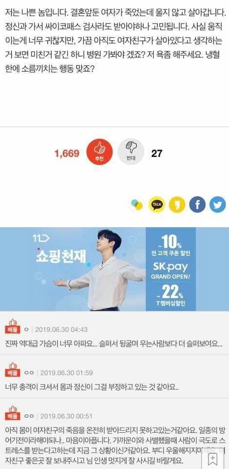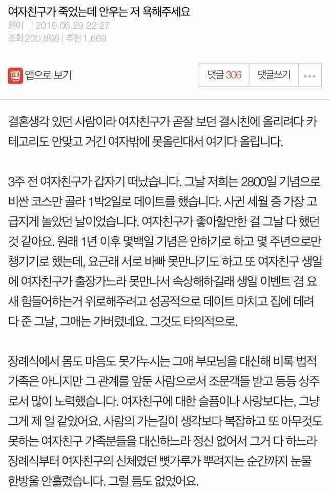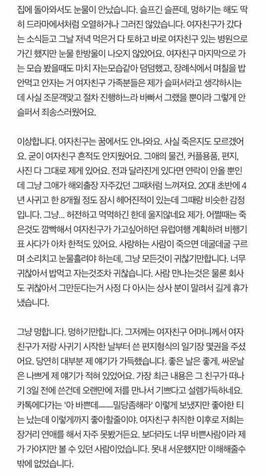 [스크랩] [눈물한방울]여자친구가 죽었는데 눈물이 안나요.. 작성자염치아줌마|작성시간25.05.17|조회수15,615 목록 댓글 52 글자크기 작게가 글자크기 크게가 * 업로더 유의사항 : 정치, 성혐오, 광고, 분쟁성, 어그로 게시물작성 금지* 댓글러 유의사항 : 정치, 성혐오, 광고, 분쟁성, 어그로 댓글작성 금지 다음검색 스크랩 원문 : 도탁스 (DOTAX) 현재 게시글 추가 기능 열기 북마크 공유하기 신고 센터로 신고 댓글 댓글 52 댓글쓰기 답글쓰기 댓글 리스트 답댓글 작성자냥냥치킨 | 작성시간 25.05.17 중간에 타의라고 써져있는거보면 아마 교통사고 당하신게 아닐까 하는… 작성자함냐함냐배고파 | 작성시간 25.05.17 지금은 괜찮아졌으려나... 너무슬프네 작성자힙스누피 | 작성시간 25.05.17 타의적으로 가버렸다는게 뭘까ㅜ 사고였을까 .. 너무 슬프다 작성자일론머스캣 | 작성시간 25.05.17 너무 큰 충격에 몸이 스스로를 보호하려고 회피하나봐… ㅠㅠ 눈물난다… 작성자가장빛나는네게말할게 | 작성시간 25.05.17 하 ㅜ 댓글 전체보기